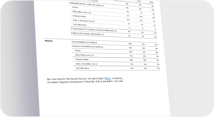 104 2021 Sustainability Report Responsible Business Practices Performance Data Our People and Culture A Modern, High-Performing Health System Introduction Environmental Health 2019 2020 2021 Hiring and Turnover Total Number of New External Employees Hired (Global Workforce) 48,395 45,621 68,565 % External Female Hired (U.S. Workforce) 72% 74% 76% % External People of Color Hired (U.S. Workforce)* 53% 52% 54% % Asian* 8% 7% 8% % Black/African American* 21% 20% 22% % Hispanic/Latino* 19% 20% 19% % Two or More Ethnic Groups* 4% 4% 4% % All Other Races* 1% 1% 1% % Open Positions Filled by Internal Candidates (Global Workforce) 26% 24% 27% % Total Voluntary Turnover (Global Workforce) 14% 12% 18% Retention % Female Retained (U.S. Workforce) 85% 87% 81% % People of Color Retained (U.S. Workforce) 83% 85% 79% % Asian 89% 91% 87% % Black/African American 79% 83% 74% % Hispanic/Latino 83% 85% 77% % Two or More Ethnic Groups 79% 82% 75% % All Other Races 84% 85% 81% Our most recently filed Federal Employer Information Report EEO-1 , representing U.S.-based integrated employees as of December 2021, is available for download.
