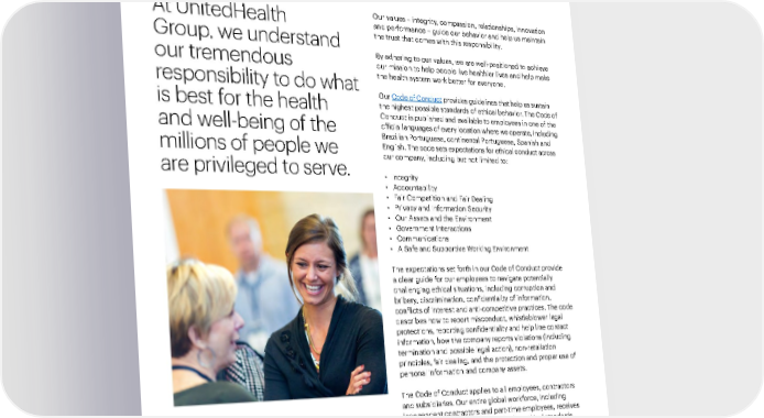 Our People and Culture 84 2021 Sustainability Report Responsible Business Practices A Modern, High-Performing Health System Introduction Performance Data Environmental Health Compliance and ethics Our values – integrity, compassion, relationships, innovation and performance – guide our behavior and help us maintain the trust that comes with this responsibility. By adhering to our values, we are well-positioned to achieve our mission to help people live healthier lives and help make the health system work better for everyone. Our Code of Conduct provides guidelines that help us sustain the highest possible standards of ethical behavior. The Code of Conduct is published and available to employees in one of the official languages of every location where we operate, including Brazilian Portuguese, continental Portuguese, Spanish and English. The code sets expectations for ethical conduct across our company, including but not limited to: • Integrity • A ccountability • F air Competition and Fair Dealing • Priv acy and Information Security • Our Assets and the En vironment • Go vernment Interactions • Communications • A Saf e and Supportive Working Environment The expectations set forth in our Code of Conduct provide a clear guide for our employees to navigate potentially challenging ethical situations, including corruption and bribery, discrimination, confidentiality of information, conflicts of interest and anti-competitive practices. The code describes how to report misconduct, whistleblower legal protections, reporting confidentiality and help line contact information, how the company reports violations (including termination and possible legal action), non-retaliation principles, fair dealing, and the protection and proper use of personal information and company assets. The Code of Conduct applies to all employees, contractors and subsidiaries. Our entire global workforce, including independent contractors and part-time employees, receives periodic training on our code and other ethical standards. New team members complete training on the code as part of their onboarding, and employees confirm annually they have read the code and adhere to its principles. UnitedHealth Group’s policy is to provide a respectful work environment that is free from all forms of harassment, including sexual harassment. At UnitedHealth Group, we understand our tremendous responsibility to do what is best for the health and well-being of the millions of people we are privileged to serve.