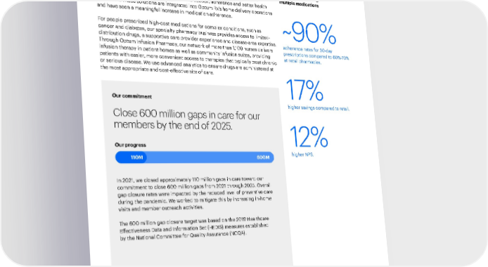 Introduction 29 2021 Sustainability Report A Modern, High-Performing Health System Our People and Culture Environmental Health Responsible Business Practices Performance Data Medication management is a critical part of caring for people with complex or chronic conditions, as they often require multiple drugs or treatments for rare diseases. To help consumers manage complex medication regimens, our personalized multidose packaging solutions support adherence and better health outcomes. These solutions are integrated into Optum Rx’s home delivery operations and have seen a meaningful increase in medication adherence. For people prescribed high-cost medications for complex conditions, such as cancer and diabetes, our specialty pharmacy business provides access to limited- distribution drugs, a supportive care provider experience and disease-area expertise. Through Optum Infusion Pharmacy, our network of more than 1,100 nurses delivers infusion therapy in patient homes as well as community infusion suites, providing patients with easier, more convenient access to therapies that typically treat chronic or serious disease. We use advanced analytics to ensure drugs are administered at the most appropriate and cost-effective site of care. Home delivery outcomes for consumers taking multiple medications ~90% adherence rates for 30-day prescriptions compared to 60%-70% at retail pharmacies. 12% higher NPS. 17% higher savings compared to retail. Our commitment Close 600 million gaps in care for our members by the end of 2025. In 2021, we closed approximately 110 million gaps in care toward our commitment to close 600 million gaps from 2021 through 2025. Overall gap closure rates were impacted by the reduced level of preventive care during the pandemic. We worked to mitigate this by increasing in-home visits and member outreach activities. The 600 million gap closure target was based on the 2019 Healthcare Effectiveness Data and Information Set (HEDIS) measures established by the National Committee for Quality Assurance (NCQA). 600M 110M Our progress