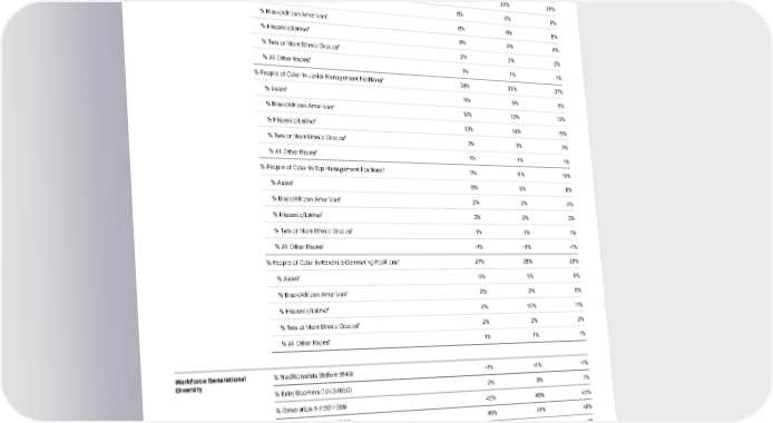 103 2021 Sustainability Report Responsible Business Practices Performance Data Our People and Culture A Modern, High-Performing Health System Introduction Environmental Health 2019 2020 2021 People of Color Leadership Diversity (U.S. Workforce) % People of Color in Management Positions* 27% 29% 29% % Asian* 8% 9% 9% % Black/African American* 8% 8% 8% % Hispanic/Latino* 8% 9% 9% % Two or More Ethnic Groups* 2% 2% 2% % All Other Races* 1% 1% 1% % People of Color in Junior Management Positions* 34% 36% 37% % Asian* 5% 5% 5% % Black/African American* 12% 13% 13% % Hispanic/Latino* 13% 14% 15% % Two or More Ethnic Groups* 3% 3% 3% % All Other Races* 1% 1% 1% % People of Color in Top Management Positions 2 11% 11% 16% % Asian 2 5% 6% 8% % Black/African American 2 2% 2% 4% % Hispanic/Latino 2 3% 2% 3% % Two or More Ethnic Groups 2 1% 1% 1% % All Other Races 2 <1% <1% <1% % People of Color in Revenue-Generating Positions* 27% 28% 29% % Asian* 6% 6% 6% % Black/African American* 9% 9% 9% % Hispanic/Latino* 9% 10% 11% % Two or More Ethnic Groups* 2% 2% 2% % All Other Races* 1% 1% 1% Workforce Generational Diversity % Traditionalists (Before 1943) <1% <1% <1% % Baby Boomers (1943-1960) 9% 8% 7% % Generation X (1961-1981) 46% 45% 43% % Generation Y (1982-2000) 45% 47% 49% % Generation Z (2001+) <1% <1% <1%