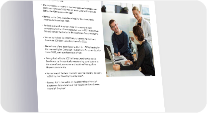 Introduction Our People and Culture Environmental Health 10 2021 Sustainability Report A Modern, High-Performing Health System Responsible Business Practices Performance Data Recognition UnitedHealth Group is proud to be recognized by the following organizations: • The top-r anked company in the insurance and managed care sector on Fortune’s 2022 World’s Most Admired Companies list for the 12th consecutive year. • Named to the Do w Jones Sustainability World and North America Indices since 1999. • Rank ed as one of America’s most community-minded companies for the 10th consecutive year in 2021 by the Civic 50 and named the leader in the Healthcare Sector category. • Named to F orbes’ list of 2021 World’s Best Employers and America’s 500 Best Large Employers for 2022. • Named one of the Be st Places to Work for LGBTQ Equality by the Human Rights Campaign Foundation’s Corporate Equality Index 2022, with a perfect score of 100. • R ecognized with the 2021 Brillante Award for Corporate Excellence by Prospanica for outstanding contributions to the educational, economic and social well-being of the Hispanic community. • Named one of the be st places to work for disability inclusion in 2021 by the Disability Equality Index®. • Rank ed 4th in the nation on the 2022 Military Friendly® Employers list and also as a Top Ten 2022 Military Spouse Friendly® Employer.