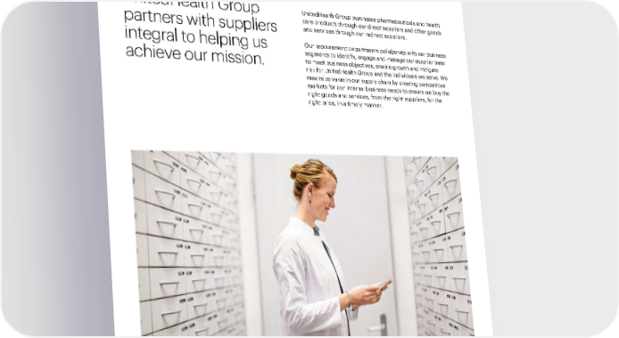 Our People and Culture 88 2021 Sustainability Report Responsible Business Practices A Modern, High-Performing Health System Introduction Performance Data Environmental Health Supply chain management UnitedHealth Group partners with suppliers integral to helping us achieve our mission. UnitedHealth Group purchases pharmaceuticals and health care products through our direct suppliers and other goods and services through our indirect suppliers. Our procurement departments collaborate with our business segments to identify, engage and manage our supplier base to meet business objectives, enable growth and mitigate risk for UnitedHealth Group and the individuals we serve. We maximize value in our supply chain by creating competitive markets for our internal business needs to ensure we buy the right goods and services, from the right suppliers, for the right price, in a timely manner.