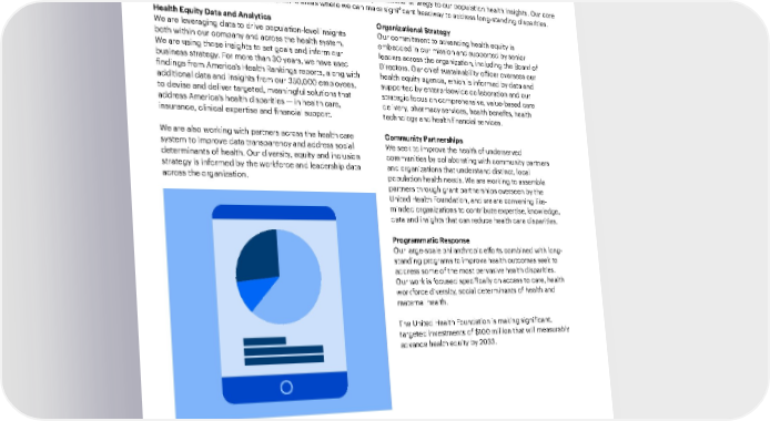 Introduction 20 2021 Sustainability Report A Modern, High-Performing Health System Our People and Culture Environmental Health Responsible Business Practices Performance Data Our health equity focus areas Health equity is ingrained in our business operations, from our organizational strategy to our population health insights. Our core areas of focus are reflective of the specific areas where we can make significant headway to address long-standing disparities. Health Equity Data and Analytics We are leveraging data to drive population-level insights both within our company and across the health system. We are using those insights to set goals and inform our business strategy. For more than 30 years, we have used findings from America’s Health Rankings reports, along with additional data and insights from our 350,000 employees, to devise and deliver targeted, meaningful solutions that address America’s health disparities — in health care, insurance, clinical expertise and financial support. We are also working with partners across the health care system to improve data transparency and address social determinants of health. Our diversity, equity and inclusion strategy is informed by the workforce and leadership data across the organization. Organizational Strategy Our commitment to advancing health equity is embedded in our mission and supported by senior leaders across the organization, including the Board of Directors. Our chief sustainability officer oversees our health equity agenda, which is informed by data and supported by enterprisewide collaboration and our strategic focus on comprehensive, value-based care delivery, pharmacy services, health benefits, health technology and health financial services. Community Partnerships We seek to improve the health of underserved communities by collaborating with community partners and organizations that understand distinct, local population health needs. We are working to assemble partners through grant partnerships overseen by the United Health Foundation, and we are convening like- minded organizations to contribute expertise, knowledge, data and insights that can reduce health care disparities. Programmatic Response Our large-scale philanthropic efforts combined with long- standing programs to improve health outcomes seek to address some of the most pervasive health disparities. Our work is focused specifically on access to care, health workforce diversity, social determinants of health and maternal health. The United Health Foundation is making significant, targeted investments of $100 million that will measurably advance health equity by 2033.