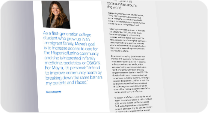 Our People and Culture Environmental Health Responsible Business Practices Performance Data Introduction Our People and Culture Environmental Health 2021 Sustainability Report A Modern, High-Performing Health System Responsible Business Practices Performance Data Meet a UNLV scholar As a first-generation college student who grew up in an immigrant family, Mayra’s goal is to increase access to care for the Hispanic/Latino community, and she is interested in family medicine, pediatrics, or OB/GYN. For Mayra, it’s personal: “I intend to improve community health by breaking down the same barriers my parents and I faced.” Mayra Repetto Providing relief to communities around the world Recognizing the impact that natural disasters, COVID-19 and geopolitical crises can have on the health of a community, UnitedHealth Group is dedicated to supporting communities around the world during times of need. Following the devastating impact of Hurricane Ida in September 2021, the United Health Foundation provided $1 million to help Louisiana residents recover and rebuild. The funds were distributed among four community- based organizations to help local residents with immediate needs like access to food and water, and to support longer-term recovery and rebuilding efforts. To address the ongoing global impact from the COVID-19 pandemic, the United Health Foundation provided $1 million in response to the coronavirus crisis in India, which was experiencing an unprecedented public health emergency with record-breaking surges in cases and deaths in May 2021. This donation builds upon the company’s global commitment to fighting COVID-19, including a previous donation of $1.5 million to India. The contribution helped fund the procurement of 2,500 oxygen concentrators, as well as other critical medical equipment essential for treating severe COVID-19 infections. To support relief efforts in Ukraine, the United Health Foundation provided $1 million in March 2022, helping children and families access food, water, hygiene kits and psychosocial support, and supporting the Ukrainian Ministry of Health with emergency medical supplies and equipment. 56