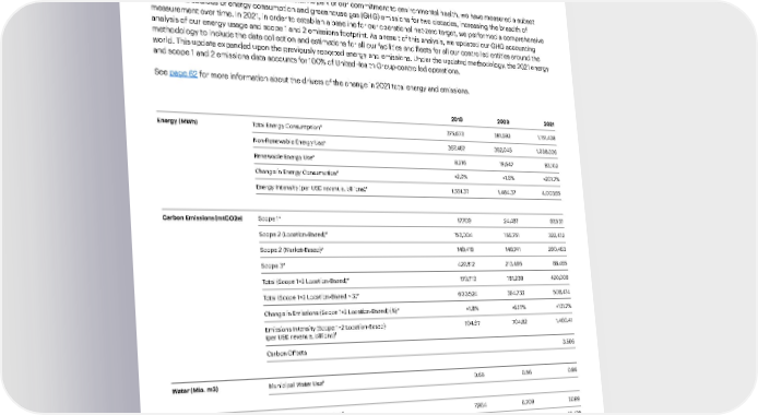 106 2021 Sustainability Report Responsible Business Practices Performance Data Our People and Culture A Modern, High-Performing Health System Introduction Environmental Health 2019 2020 2021 Energy (MWh) Total Energy Consumption* 375,673 381,692 1,151,438 Non-Renewable Energy Use* 367,457 362,045 1,068,336 Renewable Energy Use* 8,216 19,647 83,102 Change in Energy Consumption* +2.9% +1.6% +201.7% Energy Intensity (per USD revenue, billions)* 1,551.37 1,484.37 4,003.65 Carbon Emissions (mtCO2e) Scope 1* 1 7,7 0 9 24,487 97, 5 37 Scope 2 (Location-Based)* 153,004 156,751 322,472 Scope 2 (Market-Based)* 149,418 148,741 290,463 Scope 3* 429,812 213,495 88,465 Total (Scope 1+2 Location-Based)* 170,713 181,238 420,009 Total (Scope 1+2 Location-Based + 3)* 600,524 394,733 508,474 Change in Emissions (Scope 1+2 Location-Based) (%)* +1.8% +6.17% +131.7% Emissions Intensity (Scope 1+2 Location-Based) (per USD revenue, billions)* 704.97 704.82 1,460.41 Carbon Offsets 3,596 Water (Mio. m3) Municipal Water Use* 0.65 0.56 0.86 Waste (Metric Tonnes) Total Waste Used/Recycled* 7,9 6 4 6,709 7,0 9 9 Waste Disposed* 7,3 9 8 7,6 5 8 10,478 Confidential Paper Recycling (U.S. tons)* 6,415 4,888 4,854 Environmental Operations (Square Feet, millions) LEED Certified Facilities* 2.1 2.7 2.7 Environmental Health 4 Explanation of our energy and emissions data: As part of our commitment to environmental health, we have measured a subset of sites and sources of energy consumption and greenhouse gas (GHG) emissions for two decades, increasing the breadth of measurement over time. In 2021, in order to establish a baseline for our operational net-zero target, we performed a comprehensive analysis of our energy usage and scope 1 and 2 emissions footprint. As a result of this analysis, we updated our GHG accounting methodology to include the data collection and estimations for all our facilities and fleets for all our controlled entities around the world. This update expanded upon the previously reported energy and emissions. Under the updated methodology, the 2021 energy and scope 1 and 2 emissions data accounts for 100% of UnitedHealth Group-controlled operations. See page 62 for more information about the drivers of the change in 2021 total energy and emissions.