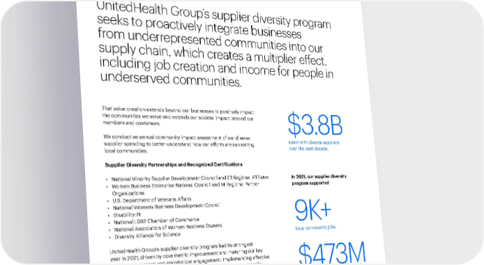 Our People and Culture 91 2021 Sustainability Report Responsible Business Practices A Modern, High-Performing Health System Introduction Performance Data Environmental Health Supplier diversity UnitedHealth Group’s supplier diversity program seeks to proactively integrate businesses from underrepresented communities into our supply chain, which creates a multiplier effect, including job creation and income for people in underserved communities. That value creation extends beyond our businesses to positively impact the communities we serve and extends our societal impact beyond our members and customers. We conduct an annual community impact assessment of our diverse supplier spending to better understand how our efforts are supporting local communities. Supplier Diversity Partnerships and Recognized Certifications • National Minority S upplier Development Council and 23 Regional Affiliates • W omen Business Enterprise National Council and 14 Regional Partner Organizations • U .S. Department of Veterans Affairs • National V eterans Business Development Council • Disability :IN • National L GBT Chamber of Commerce • National Association of W omen Business Owners • Div ersity Alliance for Science UnitedHealth Group’s supplier diversity program had its strongest year in 2021, driven by core metric improvement and maturing our key business processes and stakeholder engagement. Implementing effective control, enhancing reporting and process measurement, and broadly communicating the program’s culture and objectives helped grow Tier 1 spend with certified diverse suppliers by 17% from 2020 to 2021. $3.8B spent with diverse suppliers over the past decade. 9K+ local community jobs. $473M in employee wages. In 2021, our supplier diversity program supported