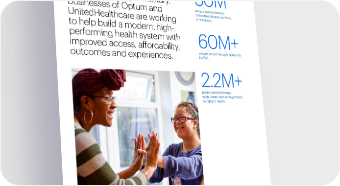 Introduction 17 2021 Sustainability Report A Modern, High-Performing Health System Our People and Culture Environmental Health Responsible Business Practices Performance Data UnitedHealth Group and our distinct, yet complementary, businesses of Optum and UnitedHealthcare are working to help build a modern, high- performing health system with improved access, affordability, outcomes and experiences. 50M people served through UnitedHealthcare’s portfolio of products. 60M+ people served through Optum Rx in 2021. 2.2M+ people served through value-based care arrangements by Optum Health.