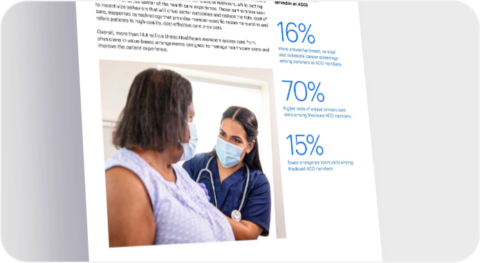 Introduction 40 2021 Sustainability Report A Modern, High-Performing Health System Our People and Culture Environmental Health Responsible Business Practices Performance Data Our work to accelerate the shift to a value-based system of care extends beyond UnitedHealthcare and Optum. By partnering with more than 119,000 providers and nearly 900 hospitals in our accountable care organizations (ACOs), UnitedHealthcare is lowering costs for Medicare, Medicaid and commercial members, while putting the consumer at the center of the health care experience. Those partnerships seek to incentivize behaviors that will drive better outcomes and reduce the total cost of care, supported by technology that provides member-specific recommendations and refers patients to high-quality, cost-effective care providers. Overall, more than 14.4 million UnitedHealthcare members access care from physicians in value-based arrangements designed to manage health care costs and improve the patient experience. 16% more preventive breast, cervical and colorectal cancer screenings among commercial ACO members. 70% higher rates of annual primary care visits among Medicare ACO members. 15% fewer emergency room visits among Medicaid ACO members. ACO member outcomes (compared to those not served in an ACO)