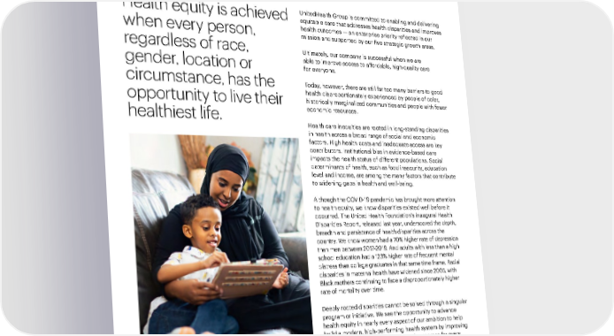 Introduction 19 2021 Sustainability Report A Modern, High-Performing Health System Our People and Culture Environmental Health Responsible Business Practices Performance Data Advancing health equity Health equity is achieved when every person, regardless of race, gender, location or circumstance, has the opportunity to live their healthiest life. UnitedHealth Group is committed to enabling and delivering equitable care that addresses health disparities and improves health outcomes — an enterprise priority reflected in our mission and supported by our five strategic growth areas. Ultimately, our company is successful when we are able to improve access to affordable, high-quality care for everyone. Today, however, there are still far too many barriers to good health disproportionately experienced by people of color, historically marginalized communities and people with fewer economic resources. Health care inequities are rooted in long-standing disparities in health across a broad range of social and economic factors. High health costs and inadequate access are key contributors. Institutional bias in evidence-based care impacts the health status of different populations. Social determinants of health, such as food insecurity, education level and income, are among the many factors that contribute to widening gaps in health and well-being. Although the COVID-19 pandemic has brought more attention to health equity, we know disparities existed well before it occurred. The United Health Foundation’s inaugural Health Disparities Report, released last year, underscored the depth, breadth and persistence of health disparities across the country. We know women had a 70% higher rate of depression than men between 2017-2019. And adults with less than a high school education had a 123% higher rate of frequent mental distress than college graduates in that same time frame. Racial disparities in maternal health have widened since 2005, with Black mothers continuing to face a disproportionately higher rate of mortality over time. Deeply rooted disparities cannot be solved through a singular program or initiative. We see the opportunity to advance health equity in nearly every aspect of our ambition to help build a modern, high-performing health system by improving access, affordability, experiences and outcomes for every person it serves.