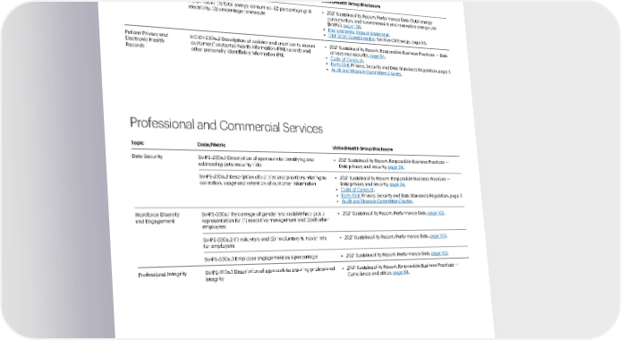 110 2021 Sustainability Report Responsible Business Practices Performance Data Our People and Culture A Modern, High-Performing Health System Introduction Environmental Health Topic Code/Metric UnitedHealth Group Disclosure Energy Management HC-DY-130a.1 (1) Total energy consumed, (2) percentage grid electricity, (3) percentage renewable • 2 021 Sustainability Report: Performance Data (Total energy consumption, and non-renewable and renewable energy use [MWh]), page 106 . • En vironmental Impact Statement . • CDP 2 020 Questionnaire : Section C8 Energy, page 65. Patient Privacy and Electronic Health Records HC-DY-230a.2 Description of policies and practices to secure customers’ protected health information (PHI) records and other personally identifiable information (PII) • 2 021 Sustainability Report: Responsible Business Practices — Data privacy and security, page 94 . • Code of Conduct . • F orm 10-K Privacy, Security and Data Standards Regulation, page 7. • A udit and Finance Committee Charter . Topic Code/Metric UnitedHealth Group Disclosure Data Security SV-PS-230a.1 Description of approach to identifying and addressing data security risks • 2 021 Sustainability Report: Responsible Business Practices — Data privacy and security, page 94 . SV-PS-230a.2 Description of policies and practices relating to collection, usage and retention of customer information • 2 021 Sustainability Report: Responsible Business Practices — Data privacy and security, page 94 . • Code of Conduct . • F orm 10-K Privacy, Security and Data Standards Regulation, page 7. • A udit and Finance Committee Charter . Workforce Diversity and Engagement SV-PS-330a.1 Percentage of gender and racial/ethnic group representation for (1) executive management and (2) all other employees • 2 021 Sustainability Report: Performance Data, page 102 . SV-PS-330a.2 (1) Voluntary and (2) involuntary turnover rate for employees • 2 021 Sustainability Report: Performance Data, page 104 . SV-PS-330a.3 Employee engagement as a percentage • 2 021 Sustainability Report: Performance Data, page 102 . Professional Integrity SV-PS-510a.1 Description of approach to ensuring professional integrity • 2 021 Sustainability Report: Responsible Business Practices — Compliance and ethics, page 84 . Health Care Delivery Professional and Commercial Services