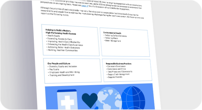 Introduction Our People and Culture Environmental Health 15 2021 Sustainability Report A Modern, High-Performing Health System Responsible Business Practices Performance Data Our sustainability priorities Assessing our sustainability priority issues is a continuous process informed by ongoing engagement with our stakeholders. We understand stakeholder priorities may evolve over time, and in 2021 we strengthened our processes to understand their perspectives on an ongoing basis. Please see page 14 for a full discussion of our stakeholder engagement. Although the priorities of each stakeholder may vary, there is a common expectation that UnitedHealth Group has the responsibility and capabilities to address the most pressing challenges facing the health care system. We focus our work and report on the following topics. Helping to Build a Modern, High-Performing Health System • He alth Equity • Expanding Access to Care • Impr oving Health Care Affordability • Enhancing the Health Care Experience • Achieving Better Health Outcomes • Building He althier Communities Our People and Culture • Div ersity, Equity and Inclusion • P ay Equity • Emplo yee Health and Well-Being • T raining and Development Environmental Health • R educing Carbon Emissions • R educing Waste • W ater Management Responsible Business Practices • Corpor ate Governance • Compliance and Ethics • Dat a Privacy and Cybersecurity • S upply Chain Management • S upplier Diversity