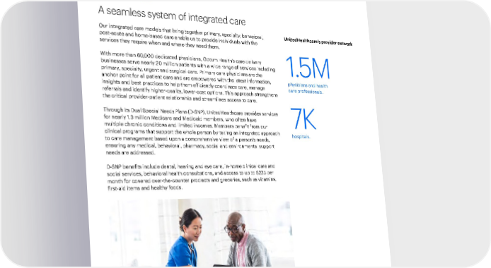 Introduction 31 2021 Sustainability Report A Modern, High-Performing Health System Our People and Culture Environmental Health Responsible Business Practices Performance Data A seamless system of integrated care Our integrated care models that bring together primary, specialty, behavioral, post-acute and home-based care enable us to provide individuals with the services they require when and where they need them. With more than 60,000 dedicated physicians, Optum Health’s care delivery businesses serve nearly 20 million patients with a wide range of services including primary, specialty, urgent and surgical care. Primary care physicians are the anchor point for all patient care and are empowered with the latest information, insights and best practices to help them efficiently coordinate care, manage referrals and identify higher-quality, lower-cost options. This approach strengthens the critical provider-patient relationship and streamlines access to care. Through its Dual Special Needs Plans (D-SNP), UnitedHealthcare provides services for nearly 1.3 million Medicare and Medicaid members, who often have multiple chronic conditions and limited incomes. Members benefit from our clinical programs that support the whole person by taking an integrated approach to care management based upon a comprehensive view of a person’s needs, ensuring any medical, behavioral, pharmacy, social and environmental support needs are addressed. D-SNP benefits include dental, hearing and eye care, in-home clinical care and social services, behavioral health consultations, and access to up to $225 per month for covered over-the-counter products and groceries, such as vitamins, first-aid items and healthy foods. UnitedHealthcare’s provider network 1.5M physicians and health care professionals. 7K hospitals.
