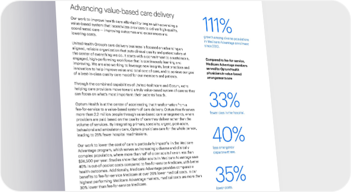 Introduction 39 2021 Sustainability Report A Modern, High-Performing Health System Our People and Culture Environmental Health Responsible Business Practices Performance Data Advancing value-based care delivery Our work to improve health care affordability begins with advancing a value-based system that incentivizes providers to deliver high-quality, coordinated care — improving outcomes and experiences and lowering costs. UnitedHealth Group’s care delivery business is focused on advancing an aligned, reliable organization that puts clinical quality and patient safety at the center of everything we do. It starts with a commitment to a sustainable, engaged, high-performing workforce that is continuously learning and improving. We are also working to leverage new insights, best practices and innovation to help improve value and total cost of care, and to achieve our goal of a best-in-class quality care model for our members and patients. Through the combined capabilities of UnitedHealthcare and Optum, we’re helping care providers move toward a truly value-based system of care so they can focus on what’s most important: their patients’ health. Optum Health is at the center of accelerating that transformation from a fee-for-service to a value-based system of care delivery. Optum Health serves more than 2.2 million people through value-based care arrangements, where providers are paid based on the quality of care they deliver rather than the volume of services. By integrating primary, specialty, urgent, post-acute, behavioral and ambulatory care, Optum physicians care for the whole person, leading to 25% fewer hospital readmissions. Our work to lower the cost of care is particularly impactful in the Medicare Advantage program, which serves an increasingly diverse and clinically complex population, where more than half of older adults live on less than $24,500 per year. Studies show that older adults in Medicare Advantage save 40% in out-of-pocket costs compared to fee-for-service Medicare, with better health outcomes. Additionally, Medicare Advantage provides comparable benefits to fee-for-service Medicare at over 20% lower medical costs. In our highest performing Medicare Advantage markets, medical costs are more than 30% lower than fee-for-service Medicare. 35% lower costs. 33% fewer days in the hospital. 40% less emergency department use. 111% growth among diverse populations in Medicare Advantage enrollment since 2013. Compared to fee-for-service, Medicare Advantage members served by Optum Health physicians in value-based arrangements saw