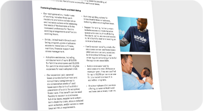 Our People and Culture 76 2021 Sustainability Report A Modern, High-Performing Health System Introduction Responsible Business Practices Performance Data Environmental Health • Our ne xt-generation, modern way of working includes three work models to promote a collaborative and inclusive culture while balancing the needs of the business with the increased preference for flexible working arrangements and flexible working hours. • Stride , UnitedHealth Group’s well- being program, gives employees access to resources on fitness, nutrition, financial support and stress management. • A doption assistance, including reimbursement of up to $10,000 for full-time employees and $5,000 for part-time employees for eligible expenses for each adopted child. • Our e xpanded paid parental leave provides both primary and non-primary caregivers up to six consecutive weeks of paid leave upon the birth of a child or placement of a child for adoption/ foster care. This benefit can be used flexibly to support a continuous full-time leave, supplement a short- term disability claim, allow a reduced work schedule, and/or extend a leave beyond FMLA requirements. • P aid caregiver leave offers two weeks of paid time off to care for a child, parent, spouse or domestic partner who has a serious mental or physical health condition. • P art-time working options for UnitedHealth Group employees, including when returning from leave. • S upport for nursing mothers, which includes access to private lactation spaces while on site, time off during the day to pump, and no-cost access to Milk Stork for mothers traveling on company business. • F amily support benefits, which offer employees center- and home-based child care or elder care, subsidized by UnitedHealth Group, to use when regular care arrangements fall through or are unavailable. • T uition reimbursement for employees who work 20 hours or more per week. They are qualified for up to $5,250 per calendar year for job-related coursework in accredited programs. • On-site emplo yee clinic services offering convenient health and wellness care at many locations. Fostering Employee Health and Well-Being Improving health and well-being At UnitedHealth Group, we aim to make healthy living easier by providing all employees with choice, flexibility and a simplified work experience.