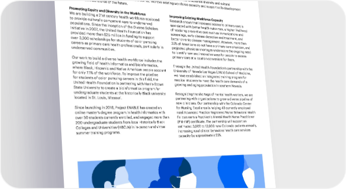 Introduction 55 2021 Sustainability Report A Modern, High-Performing Health System Our People and Culture Environmental Health Responsible Business Practices Performance Data UnitedHealth Group is building and shaping the health workforce with initiatives to advance diversity and cultural competency, develop the health care talent pipeline, improve existing workforce capacity and support skills development for the health workforce of the future. Building and shaping the health workforce Promoting Equity and Diversity in the Workforce We are building a 21st century health workforce equipped to provide culturally competent care to underserved populations. Since the inception of the Diverse Scholars Initiative in 2007, the United Health Foundation has provided more than $25 million in funding to support over 3,300 scholarships for students of color pursuing careers as primary care health professionals, particularly in underserved communities. Our work to build a diverse health workforce includes the growing field of health informatics and bioinformatics, where Black, Hispanic and Native American people account for only 7.1% of the workforce. To improve the pipeline for students of color pursuing careers in this field, the United Health Foundation is partnering with Harris-Stowe State University to create a bioinformatics program for undergraduate students at the historically Black university located in St. Louis, Missouri. Since launching in 2018, Project ENABLE has created an online master’s degree program in health informatics with over 50 students currently enrolled, and engaged more than 200 undergraduate students from local Historically Black Colleges and Universities (HBCUs) in in-person and virtual summer training programs. Improving Existing Workforce Capacity Research shows that increased access to primary care is associated with better health outcomes, a higher likelihood of receiving preventive care such as immunizations and screenings, early disease detection and treatment, and better chronic disease management. However, more than 25% of Americans do not have a primary care physician, and projected physician shortages underscore the ongoing need to identify new and innovative ways for people to access primary care at a location convenient for them. Through the United Health Foundation’s partnership with the University of Nevada Las Vegas (UNLV) School of Medicine, we have established an integrated training program for medical students to meet the health care demands of a growing and aging population in southern Nevada. Recognizing the shortage of mental health workers, we are partnering with organizations to grow a diverse pipeline of new clinicians. Our partnership with the Colorado Center for Nursing Excellence is helping 43 currently employed rural Advanced Practice Registered Nurse Behavioral Health Fellows earn a Psychiatric Mental Health Nurse Practitioner (PMHNP) certificate. The partnership will support an estimated 3,000 to 12,000 rural Colorado patients annually, increasing rural clinics’ behavioral health care services capacity by approximately 25%.