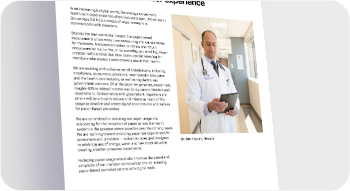 Environmental Health 65 2021 Sustainability Report A Modern, High-Performing Health System Introduction Our People and Culture Responsible Business Practices Performance Data In an increasingly digital world, the average consumer’s health care experience too often involves paper. UnitedHealth Group uses 2.8 billion sheets of paper annually to communicate with members. Beyond the environmental impact, the paper-based experience is often more time-consuming and cumbersome for members. Members are asked to review and return documents by mail or fax, or by scanning and emailing. Paper creates inefficiencies that slow down decision-making for members who expect timely answers about their health. We are working with a diverse set of stakeholders, including employers, consumers, providers, health equity advocates and the health care industry, as well as regulators and government partners. Of all the paper we generate, we estimate roughly 40% is related in some way to regulatory direction and requirement. Collaboration with government, regulators and others will be critical to reduce or eliminate as much of this usage as possible and create digital solutions and alternatives for paper-based processes. We are committed to reducing our paper usage and advocating for the reduction of paper across the health system to the greatest extent possible over the coming years. We are working toward providing paperless experiences for consumers and providers — a dual-purpose goal designed to minimize use of energy, water and raw materials while creating a better consumer experience. Reducing paper usage would also improve the speed and simplicity of our member communications by replacing paper-based communications with digital tools. Minimizing the use of paper in the consumer and provider experience Dr. Orr , Optum, Nevada