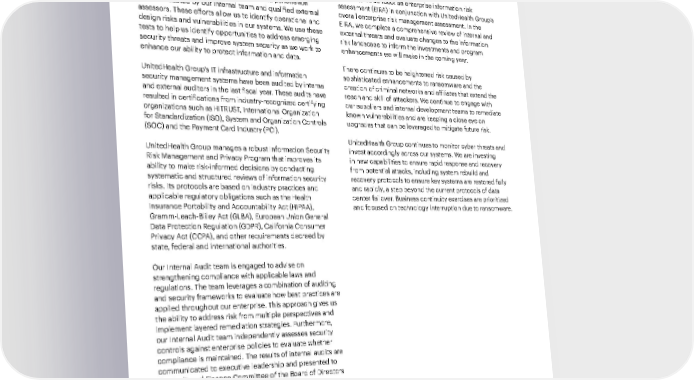 Our People and Culture 96 2021 Sustainability Report Responsible Business Practices A Modern, High-Performing Health System Introduction Performance Data Environmental Health Program evaluation We regularly evaluate the security maturity of our systems. This includes vulnerability assessments and penetration tests conducted by our internal team and qualified external assessors. These efforts allow us to identify operational and design risks and vulnerabilities in our systems. We use these tests to help us identify opportunities to address emerging security threats and improve system security as we work to enhance our ability to protect information and data. UnitedHealth Group’s IT infrastructure and information security management systems have been audited by internal and external auditors in the last fiscal year. These audits have resulted in certifications from industry-recognized certifying organizations such as HITRUST, International Organization for Standardization (ISO), System and Organization Controls (SOC) and the Payment Card Industry (PCI). UnitedHealth Group manages a robust Information Security Risk Management and Privacy Program that improves its ability to make risk-informed decisions by conducting systematic and structured reviews of information security risks. Its protocols are based on industry practices and applicable regulatory obligations such as the Health Insurance Portability and Accountability Act (HIPAA), Gramm-Leach-Bliley Act (GLBA), European Union General Data Protection Regulation (GDPR), California Consumer Privacy Act (CCPA), and other requirements decreed by state, federal and international authorities. Our Internal Audit team is engaged to advise on strengthening compliance with applicable laws and regulations. The team leverages a combination of auditing and security frameworks to evaluate how best practices are applied throughout our enterprise. This approach gives us the ability to address risk from multiple perspectives and implement layered remediation strategies. Furthermore, our Internal Audit team independently assesses security controls against enterprise policies to evaluate whether compliance is maintained. The results of internal audits are communicated to executive leadership and presented to the Audit and Finance Committee of the Board of Directors quarterly. Audit findings are tracked in the form of action plans and managed within an enterprise governance, risk and compliance tool. Owners are assigned, remediation timelines are established and progress is regularly reported to senior management. Risk assessment Annually, we conduct an enterprise information risk assessment (EIRA) in conjunction with UnitedHealth Group’s overall enterprise risk management assessment. In the EIRA, we complete a comprehensive review of internal and external threats and evaluate changes to the information risk landscape to inform the investments and program enhancements we will make in the coming year. There continues to be heightened risk caused by sophisticated enhancements to ransomware and the creation of criminal networks and affiliates that extend the reach and skill of attackers. We continue to engage with our suppliers and internal development teams to remediate known vulnerabilities and are keeping a close eye on upgrades that can be leveraged to mitigate future risk. UnitedHealth Group continues to monitor cyber threats and invest accordingly across our systems. We are investing in new capabilities to ensure rapid response and recovery from potential attacks, including system rebuild and recovery protocols to ensure key systems are restored fully and rapidly, a step beyond the current protocols of data center failover. Business continuity exercises are prioritized and focused on technology interruption due to ransomware.