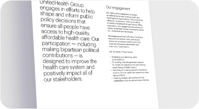 Our People and Culture 99 2021 Sustainability Report Responsible Business Practices A Modern, High-Performing Health System Introduction Performance Data Environmental Health Public policy UnitedHealth Group engages in efforts to help shape and inform public policy decisions that ensure all people have access to high-quality, affordable health care. Our participation — including making bipartisan political contributions — is designed to improve the health care system and positively impact all of our stakeholders. Our engagement Our public policy engagement is focused on addressing the most pressing health care challenges and opportunities in the communities where we live and work. Public policy efforts are led by UnitedHealth Group’s External Affairs organization, with engagement and partnership across UnitedHealth Group, including the Optum and UnitedHealthcare businesses. We engage government officials at the federal, state and international levels, serving as a trusted and solutions-oriented voice in the important discussions about health care reform and modernization. Our key areas of focus include: • De veloping and advancing public policy solutions. • Conducting internally gener ated research to provide key insights on the most pressing issues facing the health system. • P artnering with leading academic institutions to work jointly on health care research and data analysis efforts. • F ostering strategic partnerships with key stakeholders on policy and advocacy initiatives.