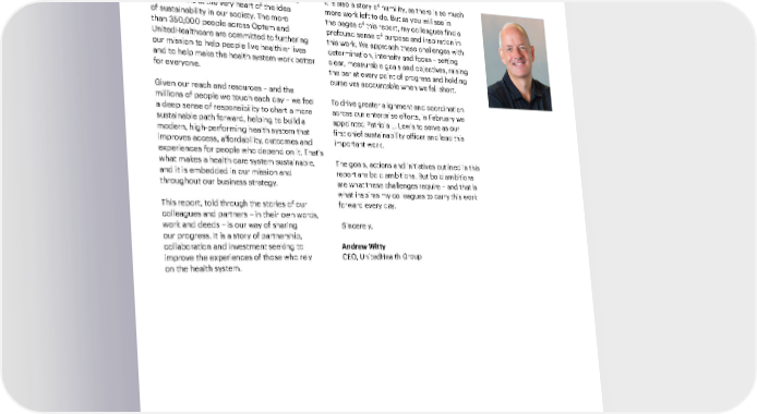 Introduction Our People and Culture Environmental Health 3 2021 Sustainability Report A Modern, High-Performing Health System Responsible Business Practices Performance Data At UnitedHealth Group, we believe a healthy population is at the very heart of the idea of sustainability in our society. The more than 350,000 people across Optum and UnitedHealthcare are committed to furthering our mission to help people live healthier lives and to help make the health system work better for everyone. Given our reach and resources – and the millions of people we touch each day – we feel a deep sense of responsibility to chart a more sustainable path forward, helping to build a modern, high-performing health system that improves access, affordability, outcomes and experiences for people who depend on it. That’s what makes a health care system sustainable, and it is embedded in our mission and throughout our business strategy. This report, told through the stories of our colleagues and partners – in their own words, work and deeds – is our way of sharing our progress. It is a story of partnership, collaboration and investment seeking to improve the experiences of those who rely on the health system. It is also a story of humility, as there is so much more work left to do. But as you will see in the pages of this report, my colleagues find a profound sense of purpose and inspiration in this work. We approach these challenges with determination, intensity and focus – setting clear, measurable goals and objectives, raising the bar at every point of progress and holding ourselves accountable when we fall short. To drive greater alignment and coordination across our enterprise efforts, in February we appointed Patricia L. Lewis to serve as our first chief sustainability officer and lead this important work. The goals, actions and initiatives outlined in this report are bold ambitions. But bold ambitions are what these challenges require – and that is what inspires my colleagues to carry this work forward every day. Sincerely, Andrew Witty CEO, UnitedHealth Group A message from our CEO