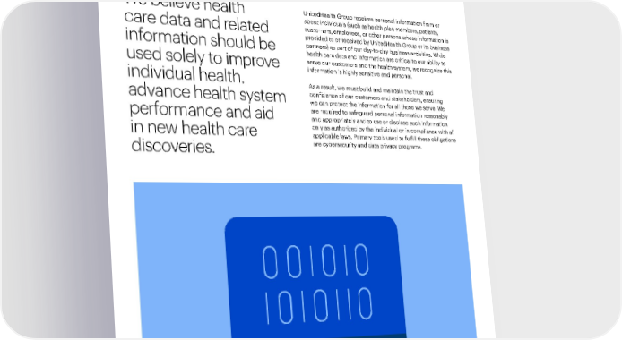 Our People and Culture 94 2021 Sustainability Report Responsible Business Practices A Modern, High-Performing Health System Introduction Performance Data Environmental Health Data privacy and security We believe health care data and related information should be used solely to improve individual health, advance health system performance and aid in new health care discoveries. UnitedHealth Group receives personal information from or about individuals (such as health plan members, patients, customers, employees, or other persons whose information is provided to or received by UnitedHealth Group or its business partners) as part of our day-to-day business activities. While health care data and information are critical to our ability to serve our customers and the health system, we recognize this information is highly sensitive and personal. As a result, we must build and maintain the trust and confidence of our customers and stakeholders, ensuring we can protect the information for all those we serve. We are required to safeguard personal information reasonably and appropriately and to use or disclose such information only as authorized by the individual or in compliance with all applicable laws. Primary tools used to fulfill these obligations are cybersecurity and data privacy programs.