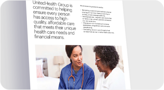 Introduction 30 2021 Sustainability Report A Modern, High-Performing Health System Our People and Culture Environmental Health Responsible Business Practices Performance Data UnitedHealth Group is committed to helping ensure every person has access to high- quality, affordable care that meets their unique health care needs and financial means. We are expanding access to care by: • Maint aining a commitment to achieve universal coverage in the United States by building on existing, proven coverage platforms. • Building se amless, integrated care models that combine virtual, primary, specialty, behavioral and post-acute care. • Bringing car e into the home with in-home assessments, drug delivery and post-acute care planning. • Connecting people to car e through virtual services that can lead to better health outcomes. Expanding access to care