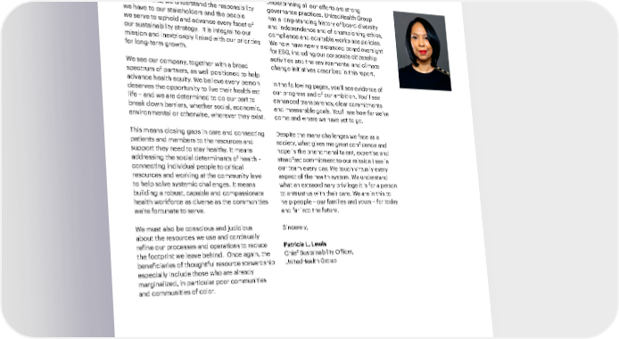 Introduction Our People and Culture Environmental Health 4 2021 Sustainability Report A Modern, High-Performing Health System Responsible Business Practices Performance Data A message from our CSO Underpinning all our efforts are strong governance practices. UnitedHealth Group has a long-standing history of board diversity and independence and of championing ethics, compliance and equitable workplace policies. We now have newly expanded board oversight for ESG, including our corporate citizenship activities and the environmental and climate change initiatives described in this report. In the following pages, you’ll see evidence of our progress and of our ambition. You’ll see enhanced transparency, clear commitments and measurable goals. You’ll see how far we’ve come and where we have yet to go. Despite the many challenges we face as a society, what gives me great confidence and hope is the phenomenal talent, expertise and steadfast commitment to our mission I see in our team every day. We touch virtually every aspect of the health system. We understand what an extraordinary privilege it is for a person to entrust us with their care. We are in this to help people – our families and yours – for today and far into the future. Sincerely, Patricia L. Lewis Chief Sustainability Officer, UnitedHealth Group As one of the world’s leading health care organizations, we understand the responsibility we have to our stakeholders and the people we serve to uphold and advance every facet of our sustainability strategy. It is integral to our mission and inextricably linked with our priorities for long-term growth. We see our company, together with a broad spectrum of partners, as well positioned to help advance health equity. We believe every person deserves the opportunity to live their healthiest life – and we are determined to do our part to break down barriers, whether social, economic, environmental or otherwise, wherever they exist. This means closing gaps in care and connecting patients and members to the resources and support they need to stay healthy. It means addressing the social determinants of health – connecting individual people to critical resources and working at the community level to help solve systemic challenges. It means building a robust, capable and compassionate health workforce as diverse as the communities we’re fortunate to serve. We must also be conscious and judicious about the resources we use and continually refine our processes and operations to reduce the footprint we leave behind. Once again, the beneficiaries of thoughtful resource stewardship especially include those who are already marginalized, in particular poor communities and communities of color.