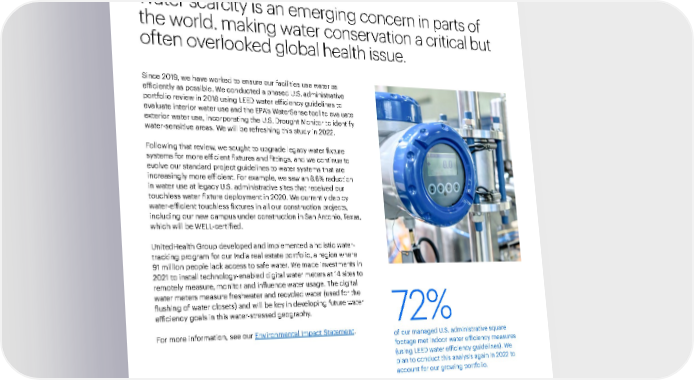 Environmental Health 67 2021 Sustainability Report A Modern, High-Performing Health System Introduction Our People and Culture Responsible Business Practices Performance Data Water scarcity is an emerging concern in parts of the world, making water conservation a critical but often overlooked global health issue. Water efficiency and reduction Since 2019, we have worked to ensure our facilities use water as efficiently as possible. We conducted a phased U.S. administrative portfolio review in 2018 using LEED water efficiency guidelines to evaluate interior water use and the EPA’s WaterSense tool to evaluate exterior water use, incorporating the U.S. Drought Monitor to identify water-sensitive areas. We will be refreshing this study in 2022. Following that review, we sought to upgrade legacy water fixture systems for more efficient fixtures and fittings, and we continue to evolve our standard project guidelines to water systems that are increasingly more efficient. For example, we saw an 8.6% reduction in water use at legacy U.S. administrative sites that received our touchless water fixture deployment in 2020. We currently deploy water-efficient touchless fixtures in all our construction projects, including our new campus under construction in San Antonio, Texas, which will be WELL-certified. UnitedHealth Group developed and implemented a holistic water- tracking program for our India real estate portfolio, a region where 91 million people lack access to safe water. We made investments in 2021 to install technology-enabled digital water meters at 14 sites to remotely measure, monitor and influence water usage. The digital water meters measure freshwater and recycled water (used for the flushing of water closets) and will be key in developing future water efficiency goals in this water-stressed geography. For more information, see our Environmental Impact Statement . 72% of our managed U.S. administrative square footage met indoor water efficiency measures (using LEED water efficiency guidelines). We plan to conduct this analysis again in 2022 to account for our growing portfolio.