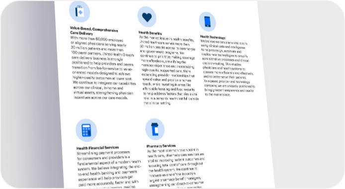 Introduction Our People and Culture Environmental Health 11 2021 Sustainability Report A Modern, High-Performing Health System Responsible Business Practices Performance Data Our strategic growth priorities Value-Based, Comprehensive Care Delivery With more than 60,000 employed or aligned physicians serving nearly 20 million patients and more than 100 payer partners, UnitedHealth Group’s care delivery business is strongly positioned to help providers and payers transition from fee-for-service to value- oriented models designed to achieve higher-quality outcomes at lower cost. We continue to integrate our capabilities across our clinical, in-home and virtual assets, strengthening physician incentives across our care models. Health Benefits As the market leader in health benefits, UnitedHealthcare serves more than 50 million people across its commercial and government programs. We continue to prioritize making coverage more affordable, simplifying the member experience and incentivizing high-quality, supported care. We’re expanding provider relationships that reward value and provide a human touch, while investing in areas like affordable housing and food security to help address factors that play a vital role in a person’s health but fall outside the clinical setting. Health Technology We believe we can play a vital role in using clinical data and intelligence to help redesign, automate and deploy new technologies to simplify administrative processes and clinical decision-making. This enables physicians and health systems to operate more efficiently and effectively, and to better serve their patients. As a payer, provider and technology company, we are uniquely positioned to bring greater transparency and quality to the marketplace. Health Financial Services Streamlining payment processes for consumers and providers is a fundamental aspect of a modern health system. We believe integrating the end- to-end health banking and payments experience will help providers get paid more accurately, faster and with less administrative burden, making payments simpler, more convenient and affordable for consumers. Pharmacy Services As the most common touch point in health care, pharmacy care services are vital to improving patient outcomes and reducing total cost of care throughout the health system. We continue to innovate as one of the industry’s largest pharmacy benefit managers, strengthening our direct-to-consumer offerings and seamlessly integrating our medical, pharmacy, behavioral and community health capabilities.