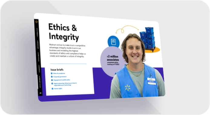 N Ethics & O TI C U D O NTR I Integrity Y T I N TU Walmart strives to make trust a competitive R O P P advantage; integrity builds trust in our O business and modeling the highest Y standards of ethics and compliance helps us T I IL B create and maintain a culture of integrity. >2 million A IN A ST associates U S completed ethics Y training in FY2022 IT N U M Issue briefs OM C Ethics & compliance { Y T Corporate governance I { R G E Engagement in public policy NT { I & S Digital citizenship: Ethical use of data & C { I responsible use of technology TH E Human rights { 41