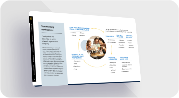 N O EARN PRIMARY DESTINATION Serve customers more broadly, deepen our TI Transforming C U (FOOD, CONSUMABLES, GM) relationship and sustain a healthy mix by expanding: D O our business NTR • In store • Delivery I HEALTH & FINANCIAL Y • Pick-up • Walmart+ ECOMMERCE WELLNESS SERVICES T I Our flywheel for N • 1P eCommerce • High quality TU • Trusted R becoming an omni- O P • 3P marketplace • Preventative P channel, regenerative • Digital O company • Accessible • Accessible Y T I • Affordable • Affordable IL B We are transforming our company to A IN provide customers with a seamless A ST omni-channel experience in stores and U S online—in a way that is regenerative. Y By regenerative, we mean fulfilling our REINVEST IN THE IT customer mission in a way that creates CUSTOMER VALUE N MONETIZE SUSTAINABLY U value for people and planet: creating PROPOSITION M opportunity, enhancing sustainability of CAPABILITIES LOWER COST OM C retail product supply chains, strengthening • Assortment communities and upholding the highest • Price • Marketplace • Store productivity Y standards of ethics and integrity. T I • Advertising • Supply chain design & R Transforming our business model toward • Experience G E an omni-channel, regenerative approach • Data automation NT I sets up a virtuous cycle that we call our • Trust & • Digital transformation S • Fulfillment C “flywheel.” Along with our assortment, I TH price and experience, we want to make • Regenerative E • Last mile trust a competitive advantage. 11