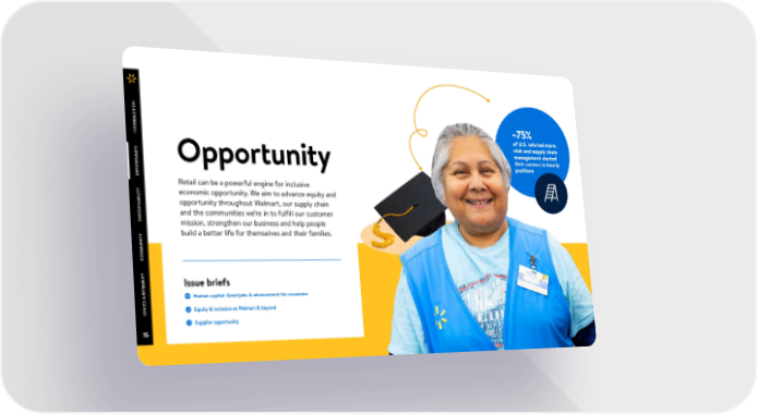 N O TI C U D ~75% O NTR of U.S. salaried store, I club and supply chain Y management started T I their careers in hourly N Opportunity TU positions R O P P O Retail can be a powerful engine for inclusive Y T economic opportunity. We aim to advance equity and I IL B A opportunity throughout Walmart, our supply chain IN A and the communities we’re in to fulfill our customer ST U S mission, strengthen our business and help people Y build a better life for themselves and their families. IT N U M OM C Y T I R G Issue briefs E NT I Human capital: Good jobs & advancement for associates & { S C I TH Equity & inclusion at Walmart & beyond E { Supplier opportunity { 15