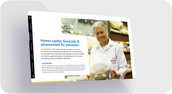 N O TI C U D O NTR I Y T I N TU R O P P O Human capital: Good jobs & Y T I IL advancement for associates B A IN A ST As one of the world’s largest private employers, we seek to U S accelerate the professional development and advancement of Y our associates and help make retail a gateway to upward mobility. IT N U Our human capital development strategy focuses on inclusion, M OM well-being, growth and digital enablement. C Y T I R INCLUSION G E We seek to make Walmart a place for everyone by creating opportunity and a sense of belonging. NT I Walmart offers jobs with low barriers to entry; for some it’s a first job and for others a second & S C chance—with access to career paths ranging from retail management to technology to health care. I TH We seek to enhance diversity across all levels in the organization. We are focused on equitably E hiring, developing and rewarding our associates. 16