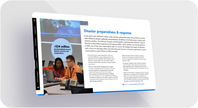 N O TI C Disaster preparedness & response U D O NTR In any given year, Walmart’s stores, clubs and the communities that surround them may face I risks related to disease outbreaks and pandemics, breakdown of infrastructure, violence and Y 57 T I extreme weather. The National Oceanic and Atmospheric Administration (NOAA) reports N TU that the United States experienced 20 separate billion-dollar weather and climate disasters R O P P in 2021, one of the most catastrophic years on record. We mitigate the impact of disasters O >$24 million donated globally toward with a focus on associate safety and well-being and recovery of business operations to serve Y T communities in need. Efforts in 2021 included: I disaster recovery and IL B A preparedness IN • We powered stores, clubs and distribution centers for • Walmart activated customer campaigns, including a A ST more than 10,000 hours using mobile generators while $5 million match program, to support the American U S grid electricity was unavailable in 2021. Generator power Red Cross’s response to Hurricane Ida and other natural Y allowed us to keep supply chain, fuel, health & wellness disasters in 2021. IT and other critical functions operating to support impacted N • The Walmart Foundation made a $3 million investment U communities. M in the Gulf region to build capacity among community- OM • When Hurricane Ida left widespread power outages, based organizations and municipal governments to help C our stores and parking lots served as hubs for resources vulnerable communities prepare for and mitigate the impact Y including medications, charging stations and laundry of disasters. T I facilities. We donated water and food, including R • Walmart and the Walmart Foundation continued to support G E 60 truckloads of produce, deli and meat, to Feeding global efforts to combat the COVID-19 pandemic. Walmart NT I America food banks in the area. Additionally, the Walmart donated more than 3,000 oxygen concentrators and & S Foundation provided over $4.3 million in grants to nonprofit C I organizations that provided hot meals, emergency relief and 20 oxygen-generating plants to the COVID-19 response in TH India. The Walmart Foundation also donated approximately E help with clean-up efforts. $2 million to two NGOs responding in India. 40 Read more: Disaster preparedness & response {
