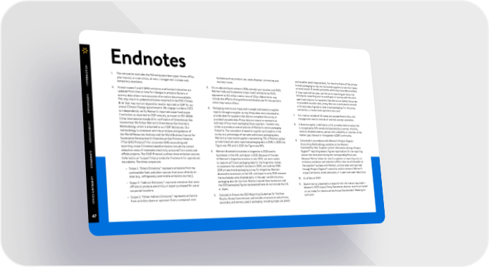 Endnotes N O TI 1. The calculation excludes the following associate types: Home office, business such as product use, waste disposal, commuting and and reusable plastic bags globally. For the time frame of the private C U pharmacists, on-site-clinics, drivers, management trainees and, business travel. brands packaging survey, we instructed suppliers to use their latest D O temporary associates. or most recent 12-month period for which they have data available. NTR 3. On an adjusted basis between 2015 calendar year baseline and 2020, If they reported last year, use the same reporting period as the I 2. Annual scopes 1 and 2 GHG emissions and Carbon Intensities are Walmart reduced its absolute scope 1 and 2 emissions by 15.6%, initial/prior reporting year to avoid gaps or overlap with the prior updated from time to time for changes in emission factors or equivalent to 3.0 million metric tons of CO e. Adjustments may activity data when more accurate information become available. 2 year’s submissions. For suppliers that did not complete the survey Y include the effects of acquisitions and divestitures for the period in or provided unusable data, proxy data was substituted to provide T I This may result in updated emissions reported in the ESG Climate which they had an effect. N a full estimate of global private brand packaging. For the proxy TU Brief that may not correspond to results reported to CDP for our calculation, a market level approach was used. R annual Climate Change questionnaire. We engage Lucideon CICS 4. Packaging metrics are measured in weight and based on supplier O P to independently verify Walmart’s reported scope 1 and scope reports through a supplier survey. Proxy data were calculated to 7. U.S. metrics include all 50 states but exclude Puerto Rico. U.S. P O 2 emissions as reported to CDP annually, pursuant to ISO 14064- provide data for suppliers that did not complete the survey or management metrics include all salaried, exempt associates. 3 (the international standard for verification of Greenhouse Gas provided unusable data. Proxy data are meant to represent an Y inventories). We follow Walmart’s Greenhouse Gas Inventory estimate of how much packaging those suppliers / markets may 8. A diverse supplier is defined as a U.S. privately held company that T is recognized as 51% owned and operated by a woman, minority, I Methodology, which is attached to our CDP disclosures. Our utilize to provide an overall picture of Walmart’s entire packaging IL veteran, disabled veteran, person with a disability or member of the B methodology is consistent with the principles and guidance of footprint. The calculation is based on supplier participation in the A survey as a percentage of net sales and known packaging data. lesbian, gay, bisexual or transgender (LGBT) community. IN the World Resources Institute and the World Business Council for A Sustainable Development’s Greenhouse Gas Protocol Initiative Walmart private brand suppliers representing 73% of Walmart global ST 9. Calculated in accordance with Walmart’s Project Gigaton U private brand net sales reported packaging data in 2019; in 2020 the S (“The GHG Protocol”) for corporate GHG accounting and Accounting Methodology, available on the Walmart reporting. scope 2 (market-based) emissions include the carbon figure was 78% and in 2021 the figure was 80%. Sustainability Hub. Suppliers submit information during a Project reduction value of renewable electricity procured from onsite and TM Y 5. Walmart divested its business in Argentina in 2020 and its Gigaton reporting season; figures reported are for the reporting IT offsite projects. The GHG Protocol outlines three emissions sources businesses in the U.K. and Japan in 2021. Because of the sale season that took place during the corresponding fiscal year. N U (referred to as “scopes”) that provide the framework for operational of Walmart’s Argentina business in late 2020, we were unable Because Walmart does not restrict suppliers to reporting only on M boundaries. The three scopes are: to capture sufficient packaging data for the Argentina market; emissions avoidance and reduction efforts that are attributable to OM to represent this market’s business in 2020, we used the 2018- the suppliers’ business with Walmart, actions taken and reported C • Scope 1, “Direct Emissions,” represent emissions from the TM combustible fuels and other sources that occur directly on 2019 private brand packaging survey for Argentina. Walmart through Project Gigaton cannot be used to measure Walmart’s Y sites (e.g., refrigerants,) and mobile emissions sources.jj divested its businesses in the U.K. and Japan in early 2021; because scope 3 emissions, either absolutely or in year-over-year reductions. T I the businesses were divested early in the year, we did not proxy R 10. As of March 2022. G • Scope 2, “Indirect Emissions,” represent emissions that occur packaging data for the time Walmart owned those businesses and E off-site to produce electricity or steam purchased for use at the 2021 packaging figures represented here do not include the U.K. 11. Board metrics presented correspond with information reported in NT I corporate locations. or Japan. Walmart’s 2022 Annual Proxy Statement; director metrics are based & S on nominees for election at the Annual Shareholders’ Meeting for C I • Scope 3, “Other Indirect Emissions,” represents emissions 6. Calculation follows the 2021 Reporting Guidelines for The New each year. TH from activities down or upstream from a company’s core Plastics Global Commitment and includes all private brand primary, E secondary and tertiary plastic packaging, including single-use plastic 47