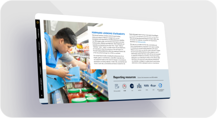 N factors discussed in Item 1A of our most recent Annual Report O FORWARD‑LOOKING STATEMENTS TI on Form 10-K and subsequent quarterly reports on Form 10-Q C This Annual Summary contains certain forward-looking U filed with the Securities and Exchange Commission (SEC); they D statements based on Walmart management’s current O also include the challenges, assumptions and dependencies NTR assumptions and expectations, including statements regarding I identified in our ESG issue briefs. our ESG targets, goals, commitments and programs and other Y business plans, initiatives and objectives. These statements are We urge you to consider all of the risks, uncertainties and T I typically accompanied by the words “aim,” “hope,” “believe,” factors identified above or discussed in such reports carefully N TU “estimate,” “plan,” “aspire” or similar words. All such statements in evaluating the forward-looking statements in this report. R O are intended to enjoy the protection of the safe harbor for Walmart cannot assure you that the results reflected or implied P P forward-looking statements within the meaning of Section 21E by any forward-looking statement will be realized or, even if O of the Securities Exchange Act of 1934, as amended. substantially realized, that those results will have the forecasted Y or expected consequences and effects. The forward-looking T Our actual future results, including the achievement of our I statements in our reporting are made as of the effective date IL B targets, goals or commitments, could differ materially from A our projected results as the result of changes in circumstances, identified on the issue brief, unless otherwise indicated and IN A assumptions not being realized, or other risks, uncertainties and we undertake no obligation to update these forward-looking ST U statements to reflect subsequent events or circumstances. S factors. Such risks, uncertainties and factors include the risk Y IT N U M OM C Y Reporting resources Click to find resources on our ESG website T I R G E NT I & S C I TH E SASB ESG issue briefs SASB GRI UNSDG TCFD CDP ESG commitments 5 and progress