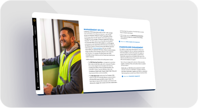 N MANAGEMENT OF ESG and help shape the evolution of the ESG field to increase O focus on shared-value impact. TI C Leadership of ESG issues starts with our CEO—with oversight U D from committees of our Board of Directors—and cascades • Other groups, such as the ESG Disclosure Committee, O NTR across our enterprise. Walmart’s Chief Sustainability Officer help to guide and shape the company’s ESG strategy I (CSO) helps define the ESG agenda and provides dedicated and disclosures. Y management and oversight of Walmart’s global ESG initiatives Read more: ESG oversight and management T and goals. The CSO reports to our Executive Vice President { I N of Corporate Affairs and provides updates on our ESG agenda TU R and progress to the Nominating and Governance Committee of O P P the Walmart Board of Directors and to the Walmart executive STAKEHOLDER ENGAGEMENT O leadership team. Board committees also have oversight responsibility for particular ESG issues. Walmart business leaders Our ability to create shared value depends on direct and Y frequent engagement with our customers, associates and T I shape and deliver ESG strategies relevant to their segments IL community leaders, as well as the people who supply our B and functions. For example, the Real Estate team leads A products, hold our stock and evaluate our performance. IN renewable energy initiatives and the People team leads human A Stakeholder perspectives and feedback help improve the ST capital initiatives. U relevance and effectiveness of the products and services we S Additional governance bodies and working teams include: offer and the initiatives we support. Y Day-to-day, we engage with customers, fellow associates, IT • The ESG Steering Committee, a management committee N suppliers, members of the communities where we operate U that meets at least biannually and is composed of leaders M from various departments throughout the business, and shareholders. OM C including the Office of the Corporate Secretary, the Additionally, our 2021 ESG priority assessment included Controller’s Office, Investor Relations, Ethics and extensive outreach to stakeholders, including customers, Y Compliance, Global Audit, People, Global Public Policy and T I associates, shareholders, suppliers and NGOs, to understand R Government Affairs and Sustainability. G their perspectives on which issues Walmart should prioritize. E NT I • The ESG department, led by the Vice President, ESG, & Read more: Stakeholder engagement S reports to the CSO and helps Walmart business leaders { C I prioritize ESG issues and define impact theses. The TH E team helps to improve ESG strategies, performance and disclosures; engage with investors and other stakeholders; 14