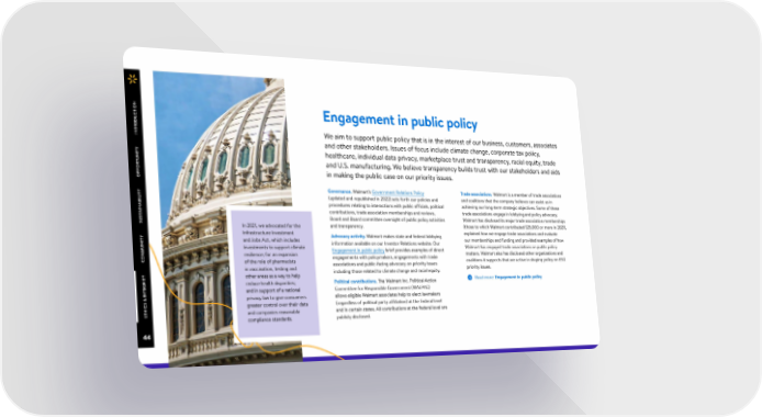 N O TI Engagement in public policy C U D O We aim to support public policy that is in the interest of our business, customers, associates NTR I and other stakeholders. Issues of focus include climate change, corporate tax policy, Y healthcare, individual data privacy, marketplace trust and transparency, racial equity, trade T I N and U.S. manufacturing. We believe transparency builds trust with our stakeholders and aids TU R O P in making the public case on our priority issues. P O Y Governance. Walmart’s Government Relations Policy Trade associations. Walmart is a member of trade associations T I (updated and republished in 2022) sets forth our policies and and coalitions that the company believes can assist us in IL B procedures relating to interactions with public officials, political achieving our long-term strategic objectives. Some of these A IN contributions, trade association memberships and reviews, trade associations engage in lobbying and policy advocacy. A ST Board and Board committee oversight of public policy activities Walmart has disclosed its major trade association memberships U S In 2021, we advocated for the and transparency. (those to which Walmart contributed $25,000 or more in 2021), Y Infrastructure Investment Advocacy activity. Walmart makes state and federal lobbying explained how we engage trade associations and evaluate IT and Jobs Act, which includes information available on our Investor Relations website. Our our memberships and funding and provided examples of how N U investments to support climate Walmart has engaged trade associations on public policy M resilience; for an expansion Engagement in public policy brief provides examples of direct matters. Walmart also has disclosed other organizations and OM engagements with policymakers, engagements with trade C of the role of pharmacists coalitions it supports that are active in shaping policy on ESG in vaccination, testing and associations and public-facing advocacy on priority issues priority issues. Y other areas as a way to help including those related to climate change and racial equity. T I Read more: Engagement in public policy R reduce health disparities; Political contributions. The Walmart Inc. Political Action { G E and in support of a national Committee for Responsible Government (WALPAC) NT I privacy law to give consumers allows eligible Walmart associates help to elect lawmakers & S C greater control over their data (regardless of political party affiliation) at the federal level I TH and companies reasonable and in certain states. All contributions at the federal level are E compliance standards. publicly disclosed. 44