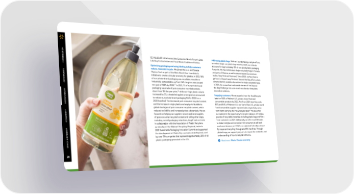 N O TI C 12.3 10x20x30 initiative and the Consumer Goods Forum’s Date Addressing plastic bags: Walmart is undertaking multiple efforts U D Labeling Call to Action and Food Waste Coalition of Action. to reduce single-use plastic bag material, which we estimate O NTR accounts for approximately 15% of our global plastic packaging I Optimizing packaging and using labeling to help customers footprint. We have eliminated single-use plastic bags in Canada reduce, reuse and recycle: We joined the U.S. and Canada and parts of Mexico, as well as several states (Connecticut, Y Plastics Pact as part of the Ellen MacArthur Foundation’s T I Maine, New York and Vermont). Since 2020, we have been a N initiative to create a circular economy for plastics. In 2021, 58% partner in Closed Loop Partners’ Beyond the Bag effort, which TU of our private brand packaging was recyclable, reusable or R aims to identify scalable alternatives to single-use plastic bags. O P industrially compostable, up from 54% the prior year, toward P In 2021, the consortium welcomed winners of the Beyond O our goal of 100% by 2030.47 In 2021, 7% of our private brand packaging was made of post-consumer recycled content, the Bag Challenge into a six-month accelerator that pilots Y 48 innovative solutions. T down from 11% the year prior, while our virgin plastic volume I IL increased by 3%, a headwind against a new goal we announced Engaging customers: We set a goal to have the How2Recycle B A to reduce our private brand packaging 15% by 2025 (vs. a label on 100% of Walmart U.S. private-brand food and IN A 2020 baseline). The decreased post-consumer recycled content consumable products by 2022. As of our 2021 reporting cycle, ST U S and the increase in virgin plastic are largely attributable to 80% and 84% of Walmart U.S. and Sam’s Club U.S., private-brand global shortages of post-consumer recycled content, which food/consumables supplier-reported sales respectively came Y reduced availability and increased prices substantially. We are from items carrying the How2Recycle label.49 We also offer IT N focused on helping our suppliers secure additional supplies our customers the opportunity to recycle, taking in >1.9 million U M of post-consumer recycled content and taking other steps, pounds of recyclable materials—including plastic bags and film— OM including overall packaging reductions, to get back on track. from customers in 2021. Additionally, we offer ecoATM kiosks C In collaboration with the Association of Plastic Recyclers, to make it simple and convenient for consumers to sell back Y we developed the Walmart Recycling Playbook, hosted a used smart devices; in FY2022, we collected 3.4 million devices T I 2021 Sustainable Packaging Innovation Summit and supported for reuse and recycling through ecoATM machines. Through R G E the development of Plastic IQ, a scenario-modeling tool, used philanthropy, we support programs to expand the availability and NT I by over 170 companies that represent approximately 20% of all understanding of how to recycle in the U.S. & S plastic packaging generated in the U.S. C I Read more: Waste: Circular economy TH { E 31