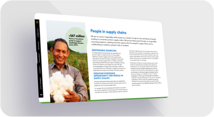 N People in supply chains O TI C U D We aim to source responsibly while acting as a catalyst to improve the well-being of people O >$67 million NTR working in consumer product supply chains. We pursue these goals through our responsible I Walmart Foundation grants to support sourcing programs, creating economic opportunity for people in supply chains and by Y smallholder farmers T I collaborating to address systemic risks to workers. N (since 2017) TU R O P P RESPONSIBLE SOURCING South Africa, Walmart teams work to develop small producers O Our Responsible Sourcing program sets expectations for as suppliers and to help them reach Walmart’s customers. In the Y product suppliers in alignment with our Human Rights U.S., our annual Open Call event allows hundreds of small- and T I medium-sized business owners from across the country to pitch IL Statement, monitors supplier performance against those B products made, grown or assembled in the U.S. to our Walmart A expectations and works through our business to continuously IN U.S. and Sam’s Club U.S. merchants. A improve our product supply chains. In FY2022, we assessed ST U S approximately 14,000 third-party audits of facilities producing Additionally, the Walmart Foundation helps promote market products for Walmart and managed more than 700 cases access for small producers. Since 2017, the Foundation has Y involving allegations of supply chain misconduct. In 2021, we awarded grants of more than $67 million that are expected IT N revised and reissued our Standards for Suppliers and issued new to benefit more than 730,000 smallholders (44% of whom U M Responsible Sourcing and Forced Labor Prevention policies. are women) in Central America, India and Mexico. The grants OM provide access to training and capacity development along C CREATING ECONOMIC OPPORTUNITY FOR PEOPLE IN with market linkages for smallholders in Farmer Producer Y Organizations (FPOs). As part of these efforts, the Walmart T I Foundation committed $25 million over five years to strengthen R SUPPLY CHAINS G E smallholders in FPOs in India. The Foundation has met this NT Growing, making and transporting products can significantly I commitment through grants totaling more than $29 million, & benefit local economies and provide economic opportunity for S providing support for over 590,000 smallholder farmers, 48% of C I people who work in product supply chains. whom are women. TH E For example, 92% of merchandise sold in Mexico is sourced in the country while 83% of merchandise sold in Central America is 34 sourced from the region. In these markets as well as in India and