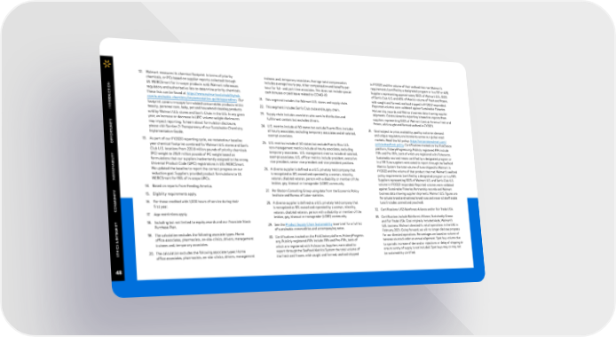 12. Walmart measures its chemical footprint in terms of priority trainees and, temporary associates. Average total compensation in FY2022 and the volume of that seafood that met Walmart’s chemicals, or PCs based on supplier reports collected through includes average hourly pay, other compensation and benefits per requirements (certified by a designated program or in a FIP or AIP). UL WERCSmart for in-scope products sold. Walmart references hour for full- and part-time associates. This does not include special Suppliers representing approximately 100% of Walmart U.S., 100% N regulatory and authoritative lists to determine priority chemicals. cash bonuses or paid leave related to COVID-19. of Sam’s Club U.S. and 45% of Mexico volume of fresh and frozen, O TI These lists can be found at https://www.walmartsustainabilityhub. wild-caught and farmed, seafood shipped in FY2022 responded. C 21. This segment includes the Walmart U.S. stores and supply chain. U com/sustainable-chemistry/implementation-guide/appendices. Our Reported volumes were validated against Sustainable Fisheries D footprint covers in-scope formulated consumables products within Partnership records and Walmart business data showing supplier O 22. This segment includes Sam’s Club clubs and supply chain. NTR beauty, personal care, baby, pet and household cleaning products shipments. Central America reporting is based on reports from I sold by Walmart U.S. stores and Sam’s Clubs in the U.S. In any given 23. Supply chain includes associates who work in distribution and suppliers representing 100% of Walmart Central America fresh and year, an increase or decrease in UPC volume weight disclosures fulfillment centers but excludes drivers. frozen, wild-caught and farmed seafood in CY2021. Y may impact reporting. To learn about formulation disclosure, 24. U.S. metrics include all 50 states but exclude Puerto Rico. Includes T 31. Goal subject to price, availability, quality, customer demand I please visit Section 2: Transparency of our Sustainable Chemistry N all hourly associates, excluding temporary associates and all salaried, and unique regulatory environments across our global retail TU Implementation Guide. exempt associates. R markets. Read the full policy: https://corporate.walmart.com/ O P 13. As part of our FY2020 reporting cycle, we restated our baseline 25. U.S. metrics include all 50 states but exclude Puerto Rico. U.S. policies#seafood-policy. Certifications tracked on the FishChoice P O year chemical footprint combined for Walmart U.S. stores and Sam’s non-management metrics include all hourly associates, excluding platform, FisheryProgress.org. Publicly registered FIPs include Club U.S. locations from 220.8 million pounds of priority chemicals temporary associates. U.S. management metrics include all salaried, FIPs and Pre-FIPs, both of which are registered with Fishsource. Y (PC) weight to 215.9 million pounds of PC weight based on exempt associates. U.S. officer metrics include president, executive Sustainably sourced means certified by a designated program or T I formulations that our suppliers inadvertently assigned to the wrong vice president, senior vice president and vice president positions. in a FIP. Tuna suppliers were asked to report through the Seafood IL B Universal Product Code (UPC) registrations in UL’s WERCSmart. Metrics System the total volume of tuna shipped to Walmart in A We updated the baseline to report the correct progress on our 26. A diverse supplier is defined as a U.S. privately held company that FY2022 and the volume of that product that met Walmart’s seafood IN A reduction goal. Suppliers provided product formulations to UL is recognized as 51% owned and operated by a woman, minority, policy requirements (certified by a designated program or in a FIP). ST U WERCSmart for 95% of in-scope UPCs. veteran, disabled veteran, person with a disability or member of the Suppliers representing 100% of Walmart U.S. and Sam’s Club U.S. S lesbian, gay, bisexual or transgender (LGBT) community. 14. Based on reports from Feeding America. volume in FY2022 responded. Reported volumes were validated Y 27. Per Boston Consulting Group using data from the Economic Policy against Sustainable Fisheries Partnership records and Walmart IT 15. Eligibility requirements apply. Institute and Bureau of Labor statistics. business data showing supplier shipments. Walmart U.S. figures are N for private brand and national brand tuna and cover all shelf-stable U 16. For those credited with 1,000 hours of service during their M 28. A diverse supplier is defined as a U.S. privately held company that tuna (includes canned and pouched). OM first year. is recognized as 51% owned and operated by a woman, minority, C veteran, disabled veteran, person with a disability or member of the 32. Certifications: UTZ-Rainforest Alliance and/or Fair Trade USA. 17. Age restrictions apply. lesbian, gay, bisexual or transgender (LGBT) community. Y 18. Including but not limited to equity awards and our Associate Stock 33. Certifications include Rainforest Alliance, Sustainably Grown T and Fair Trade USA. Goal originally included Asda, Walmart’s I Purchase Plan. 29. See the Product Supply Chain Sustainability issue brief for a full list R U.K. business. Walmart divested its retail operations in the U.K. in G of sustainable commodities and accompanying notes. E 19. The calculation excludes the following associate types: Home February 2021. Going forward, we will no longer disclose progress NT I 30. Certifications tracked on the FishChoice platform, FisheryProgress. for our divested operations. Percentages are based on volume of office associates, pharmacists, on-site-clinics, drivers, management & org. Publicly registered FIPs include FIPs and Pre-FIPs, both of bananas sourced under an annual alignment. Spot buy volume due S trainees and, temporary associates. C I which are registered with Fishsource. Suppliers were asked to to spo
