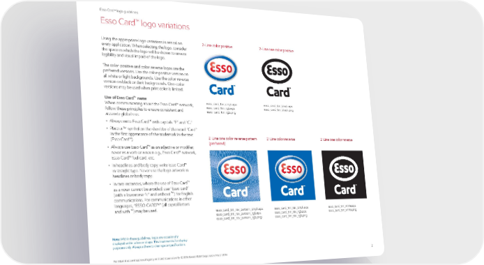 TM Esso Card logo guidelines TM Esso Card logo variations Using the appropriate logo variations is critical on 2-Line color positive 2-Line one color positive every application. When selecting the logo, consider the space in which the logo will be shown to ensure legibility and visual impact of the logo. The color-positive and color-reverse logos are the preferred versions. Use the color-positive version on all white or light backgrounds. Use the color-reverse version on black or dark backgrounds. One-color versions may be used when print color is limited. TM Use of Esso Card name esso_card_tm_cmyk.eps esso_card_tm_black.eps TM When communicating about the Esso Card network, esso_card_tm_rgb.eps esso_card_tm_black.png follow these principles to ensure consistent and esso_card_tm_rgb.png accurate global use: TM • Always write Esso Card with capitals “E” and “C.” TM • Place a symbol on the shoulder of the word “Card” in the first appearance of the trademark in the text 2-Line one color reverse pattern 2-Line color reverse 2-Line one color reverse TM (Esso Card ). (preferred) TM • Always use Esso Card as an adjective or modifier, TM never as a verb or a noun e.g., Esso Card network, TM Esso Card fuel card, etc. TM • In headlines and body copy, write Esso Card in straight type. Never use the logo artwork in headlines or body copy. • In rare instances, where the use of Esso CardTM as a noun cannot be avoided, use “Esso card” TM (with a lowercase “c” and without ) for English communications. For communications in other languages, “ESSO CARD™” (all capital letters TM and with ) may be used. esso_card_tm_rev_pattern_cmyk.eps esso_card_tm_rev_cmyk.eps esso_card_tm_white.eps esso_card_tm_rev_pattern_rgb.eps esso_card_tm_rev_rgb.eps esso_card_tm_white.png esso_card_tm_rev_pattern_rgb.png esso_card_tm_rev_rgb.png Note: Within these guidelines, logos are occasionally displayed within a box or shape. This treatment is for display purposes only. Always adhere to clear space specifications. For internal use and approved agency and card issuer use only. © 2016 Exxon Mobil Corporation. March 2016 2