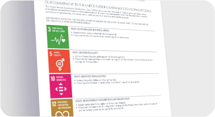 19 OUR COMMITMENT TO SOCIAL IMPACT & SUSTAINABILITY OUR COMMITMENT TO THE UNITED NATIONS SUSTAINABLE DEVELOPMENT GOALS The United Nations Sustainable Development Goals (SDGs) are a voluntary framework of 17 global goals and targets meant to accelerate advancement toward a more sustainable world. Since they were issued in 2015, they have become a common touchstone for governments, the private sector, and civil society in tracking sustainability progress. WE PRIMARILY FOCUS ON THE FIVE SDGs WHERE WE BELIEVE WE CAN HAVE THE MOST IMPACT TO HELP DELIVER ON THE VISION OF A MORE SUSTAINABLE WORLD: Our consumer engagements include: direct interaction online and in store settings; consumer feedback portals, including Consumer Care; satisfaction surveys; and social media and influencer channels. Consumer interest in social impact and sustainability includes product information; ingredient transparency; sourcing practices; and animal testing. We engage with our investors in a number of ways. We have a comprehensive, strategic investor relations program to help communicate with the investment community about our company’s performance and corporate values, as well as to educate current and prospective investors and the sell-side analyst community about our business strategies and social impact and sustainability commitments and initiatives. In fiscal 2021, we enhanced our investor outreach by expanding dialogue around our progress in social impact and sustainability. We also conduct an annual ESG investor perception study to listen and learn as we continue delivering value to our investors. SDG3. GOOD HEALTH AND WELL-BEING: • Ensure Healthy Lives and Promote Well-Being for All. • Please see the Social Investments section on page 42 for more details. SDG5. GENDER EQUALITY: • Achieve Gender Equality and Empower All Women and Girls. • Please see the Employee Experience section on page 20 and the Inclusion, Diversity & Equity section on page 32 for more details. SDG10. REDUCED INEQUALITIES: • Reduce Inequality Within and Among Countries. • Please see the Inclusion, Diversity & Equity section on page 32 for more details. SDG12. RESPONSIBLE CONSUMPTION AND PRODUCTION : • Ensure Sustainable Consumption and Production Patterns. • Please see the Responsible Sourcing section on page 68, the Product Formulation section on page 78, and the Packaging section on page 86 for more details. SDG13. CLIMATE ACTION: • Take Urgent Action to Combat Climate Change and Its Impacts. • Please see the Climate and Environment section on page 54 for more details.