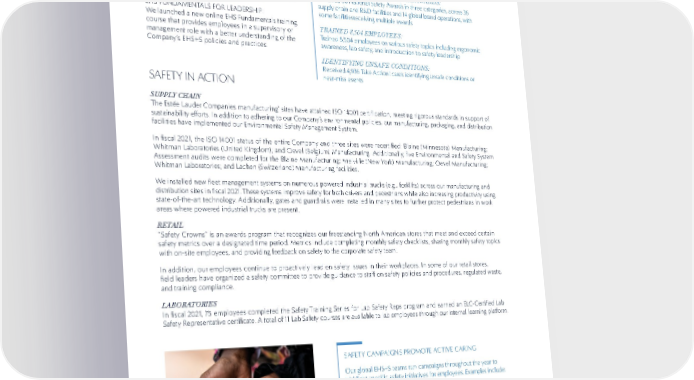 23 SOCIAL IMPACT EMPLOYEE EXPERIENCE HEALTH AND SAFETY TRAINING We seek to keep our workforce up-to-date on safety policies, procedures, and expectations. In fiscal 2021, we made important updates and additions to our curriculum: BBS MANAGEMENT AWARENESS TRAINING: To further support the BBS program, the BBS Management Awareness training course was revised and made available online for employees in management roles. EHS FUNDAMENTALS FOR LEADERSHIP: We launched a new online EHS Fundamentals training course that provides employees in a supervisory or management role with a better understanding of the Company’s EHS+S policies and practices. SAFETY CAMPAIGNS PROMOTE ACTIVE CARING Our global EHS+S teams run campaigns throughout the year to highlight specific safety initiatives for employees. Examples include: • Monthly tip sheets were created and delivered to Global Retail employees highlighting safety topics such as fire preparedness, ladder and step stool safety, and avoidance of “struck by” injuries. • During ergonomic awareness month in October, safety tips were shared throughout our various working environments. • For Safety Month in June, safety resources were promoted through various channels. We also invited all employees to share a caring moment or a safety tip via a dedicated email account. SAFETY IN ACTION SUPPLY CHAIN The Estée Lauder Companies manufacturing * sites have attained ISO 14001 certification, meeting rigorous standards in support of sustainability efforts. In addition to adhering to our Company’s environmental policies, our manufacturing, packaging, and distribution facilities have implemented our Environmental Safety Management System. In fiscal 2021, the ISO 14001 status of the entire Company and three sites were recertified: Blaine (Minnesota) Manufacturing; Whitman Laboratories (United Kingdom); and Oevel (Belgium) Manufacturing. Additionally, five Environmental and Safety System Assessment audits were completed for the Blaine Manufacturing; Melville (New York) Manufacturing; Oevel Manufacturing; Whitman Laboratories; and Lachen (Switzerland) Manufacturing facilities. We installed new fleet management systems on numerous powered industrial trucks (e.g., forklifts) across our manufacturing and distribution sites in fiscal 2021. These systems improve safety for both drivers and pedestrians while also increasing productivity using state-of-the-art technology. Additionally, gates and guardrails were installed in many sites to further protect pedestrians in work areas where powered industrial trucks are present. RETAIL “Safety Crowns” is an awards program that recognizes our freestanding North American stores that meet and exceed certain safety metrics over a designated time period. Metrics include completing monthly safety checklists, sharing monthly safety topics with on-site employees, and providing feedback on safety to the corporate safety team. In addition, our employees continue to proactively lead on safety issues in their workplaces. In some of our retail stores, field leaders have organized a safety committee to provide guidance to staff on safety policies and procedures, regulated waste, and training compliance. LABORATORIES In fiscal 2021, 75 employees completed the Safety Training Series for Lab Safety Reps program and earned an ELC-Certified Lab Safety Representative certificate. A total of 11 Lab Safety courses are available to lab employees through our internal learning platform. * Not inclusive of packaging, distribution, and R&D sites. Excludes sites that were acquired after January 1, 2020. IN FISCAL 2021: ZERO RECORDABLE ACCIDENTS: Achieved zero recordable accidents across many of our facilities, including six manufacturing sites, 19 distribution centers, and six Research and Development (R&D) sites 2020 NATIONAL SAFETY COUNCIL AWARDS: Received 68 National Safety Awards in three categories, across 36 supply chain and R&D facilities and 14 global brand operations, with some facilitiesreceiving multiple awards TRAINED 8,504 EMPLOYEES: Trained 8,504 employees on various safety topics including ergonomic awareness, lab safety, and introduction to safety leadership IDENTIFYING UNSAFE CONDITIONS: Received 4,936 Take Action! cards identifying unsafe conditions or near-miss events