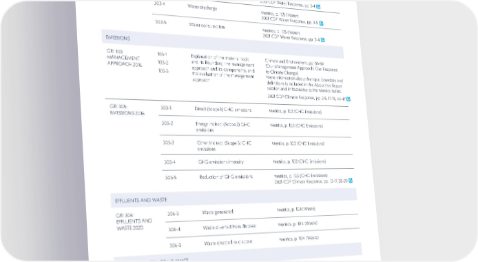 112 GRI / SASB / TCFD INDEXES GRI STANDARD GRI STANDARD DISCLOSURE DISCLOSURE DESCRIPTION DESCRIPTION RESPONSE RESPONSE TOPIC-SPECIFIC STANDARDS WATER AND EFFLUENTS GRI 303: WATER AND EFFLUENTS 2018 303-3 Water withdrawal Metrics, p. 105 (Water) 2021 CDP Water Response, pp. 3-4 303-4 Water discharge Metrics, p. 105 (Water) 2021 CDP Water Response, pp. 3-5 303-5 Water consumption Metrics, p. 105 (Water) 2021 CDP Water Response, pp. 3-4 EMISSIONS GRI 103: MANAGEMENT APPROACH 2016 103-1 103-2 103-3 Explanation of the material topic and its Boundary; the management approach and its components, and the evaluation of the management approach Climate and Environment, pp. 55-59 (Our Management Approach; Our Response to Climate Change) More information about the topic boundary and definitions is included in the About this Report section and in footnotes to the Metrics tables. 2021 CDP Climate Response, pp. 2-5, 11-19, 44-47 GRI 305: EMISSIONS 2016 305-1 Direct (Scope 1) GHG emissions Metrics, p. 103 (GHG Emissions) 305-2 Energy indirect (Scope 2) GHG emissions Metrics, p. 103 (GHG Emissions) 305-3 Other indirect (Scope 3) GHG emissions Metrics, p. 103 (GHG Emissions) 305-4 GHG emissions intensity Metrics, p. 103 (GHG Emissions) 305-5 Reduction of GHG emissions Metrics, p. 103 (GHG Emissions) 2021 CDP Climate Response, pp. 13-17, 28-29 EFFLUENTS AND WASTE GRI 306: EFFLUENTS AND WASTE 2020 306-3 Waste generated Metrics, p. 104 (Waste) 306-4 Waste diverted from disposal Metrics, p. 104 (Waste) 306-5 Waste directed to disposal Metrics, p. 104 (Waste) ENVIRONMENTAL COMPLIANCE GRI 307: ENVIRONMENTAL COMPLIANCE 2016 307-1 Non-compliance with environmental laws and regulations In fiscal 2021, we were not subject to any environmental fines or penalties.