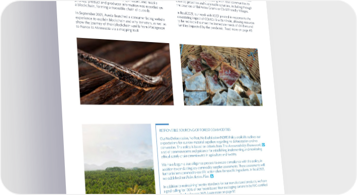 73 SUSTAINABILITY RESPONSIBLE SOURCING VANILLA We seek to increase transparency and traceability within our most complicated and sensitive supply chains, such as vanilla, which we use as a fragrance in products across our portfolio. In fiscal 2021, we completed the second year of a pilot program in which our Responsible Sourcing team and Aveda used blockchain technology to trace our Madagascan vanilla supply chain from harvest through production. Using digital ID cards, unique identification codes via a QR reader, and mobile phones, product and producer information was recorded on a blockchain, forming a traceable chain of custody. In September 2021, Aveda launched a consumer facing website experience to explain blockchain and why it matters, as well as show the journey of their blockchain vanilla from Madagascar to France to Minnesota via a mapping tool. MICA Mica is used in some cosmetics to provide a pearlescent effect. We continue to engage with stakeholders in India to address the risk of child labor in the mica supply chain. For example, since 2005, we have partnered with the Kailash Satyarthi Children’s Foundation (KSCF). KSCF works to eliminate child labor in India by partnering with local communities to develop proactive and sustainable solutions, including through the creation of Bal Mitra Grams or Child Friendly Villages. In fiscal 2021, our work with KSCF pivoted in response to the devastating impact of COVID-19 within India, allowing resources to be redirected to meet the immediate needs of children and families impacted by the pandemic. Read more on page 49. RESPONSIBLE SOURCING OF FOREST COMMODITIES Our No Deforestation, No Peat, No Exploitation (NDPE) Policy explicitly outlines our expectations for our raw material suppliers regarding no deforestation and no conversion. The policy is based on criteria from The Accountability Framework , a set of common norms and guidance for establishing, implementing, and monitoring ethical supply chain commitments in agriculture and forestry. We have begun a due diligence process to ensure compliance with the policy, in addition to conducting key commodity supplier assessments. These assessments will further inform commodity-specific action plans for specific ingredients. In fiscal 2021, we published our Palm Action Plan . In addition to maintaining forestry standards for our manufactured products, we have a goal calling for 100% of our forest-based fiber packaging cartons to be FSC-certified by the end of calendar year 2025. Learn more on page 87. Our brands also support environmental causes, including a commitment to help safeguard the health of forests for future generations. For example, Origins has long supported environmental nonprofit organizations that support tree planting efforts, help restore ecosystems, benefit local communities, and fight climate change. Read more on page 51. For more information about our assessment of risk and response to forest-based commodities, please read our response to the CDP Forests Questionnaire.
