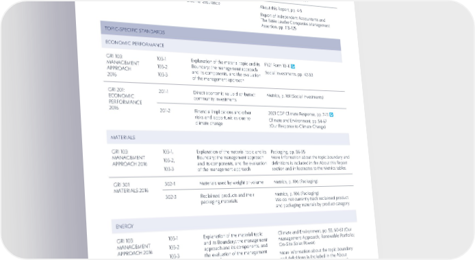 111 GRI / SASB / TCFD INDEXES GRI STANDARD GRI STANDARD DISCLOSURE DISCLOSURE DESCRIPTION DESCRIPTION RESPONSE RESPONSE GENERAL DISCLOSURES REPORTING PRACTICE GRI 102: GENERAL DISCLOSURES 2016 102-55 GRI content index GRI content index, pp. 107-114 102-56 External assurance About this Report, pp. 4-5 Report of Independent Accountants and The Estée Lauder Companies Management Assertion, pp. 118-125 TOPIC-SPECIFIC STANDARDS ECONOMIC PERFORMANCE GRI 103: MANAGEMENT APPROACH 2016 103-1 103-2 103-3 Explanation of the material topic and its Boundary; the management approach and its components, and the evaluation of the management approach FY21 Form 10-K Social Investments, pp. 42-53 GRI 201: ECONOMIC PERFORMANCE 2016 201-1 Direct economic value distributed: community investments Metrics, p. 101 (Social investments) 201-2 Financial implications and other risks and opportunities due to climate change 2021 CDP Climate Response, pp. 7-11 Climate and Environment, pp. 54-67 (Our Response to Climate Change) MATERIALS GRI 103: MANAGEMENT APPROACH 2016 103-1, 103-2, 103-3 Explanation of the material topic and its Boundary; the management approach and its components, and the evaluation of the management approach Packaging, pp. 86-95 More information about the topic boundary and definitions is included in the About this Report section and in footnotes to the Metrics tables. GRI 301: MATERIALS 2016 302-1 Materials used by weight or volume Metrics, p. 106 (Packaging) 302-3 Reclaimed products and their packaging materials Metrics, p. 106 (Packaging) We do not currently track reclaimed product and packaging materials by product category. ENERGY GRI 103: MANAGEMENT APPROACH 2016 103-1 103-2 103-3 Explanation of the material topic and its Boundary; the management approach and its components, and the evaluation of the management approach Climate and Environment, pp. 55, 60-61 (Our Management Approach; Renewable Portfolio; On-Site Solar Power) More information about the topic boundary and definitions is included in the About this Report section and in footnotes to the Metrics tables. 2021 CDP Climate Response, pp. 13-18, 29-41 GRI 302: ENERGY 2016 302-1 Energy consumption within the organization Metrics, p. 104 (Energy) 302-3 Energy intensity Metrics, p. 104 (Energy) 302-4 Reduction of energy consumption Metrics, p. 104 (Energy) ( continued)