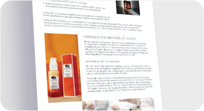 89 SUSTAINABILITY PACKAGING Our Sustainable Packaging Guidelines contain an overview of our approach, definitions, material selection guides, and FAQs. They outline our priorities, which include: • Reducing and removing packaging where possible • Designing for reuse and refillability • Building designed-in recyclability • Increasing amounts of PCR material in packaging • Replacing petroleum-based plastics with bioplastics (if the bioplastic can be recycled and does not contaminate traditional recycling streams). In fiscal 2021, we continued to upskill and educate employees and provided training on the Guidelines for our package developers, marketers, and procurement teams. Along with the Guidelines, we use additional tools to develop more responsible packaging. These include custom-developed methodologies to calculate the sustainability profile of various product-packaging formats and estimated associated GHG emissions, as well as third-party reviewed life-cycle assessments, as needed, to provide a holistic view of a package’s impacts. SUSTAINABILITY IN NEW PRODUCT LAUNCH The early development and design phase of a product and package is a critical time for integrating consideration of potential environmental impacts. In fiscal 2021, we redesigned our new product launch process to create more consistency and continuity, with sustainability principles woven in throughout. Brands are now asked to address how they will incorporate one of the 5Rs into new product packaging at the beginning of the design phase, allowing progress to be tracked from the onset. SECONDARY AND TERTIARY PACKAGING The intent of secondary and tertiary packaging is to protect the integrity of our products while also providing a High-Touch experience. We are working to reduce the environmental impacts of shipping and its associated packaging, including by selecting more sustainable materials and eliminating excess material and volume. For example, many brands now use dissolvable packaging peanuts in their shipping boxes and have reduced the amount of paper used in mailers. In our Europe, Middle East, and Africa (EMEA) region, new shipping boxes are free of plastic, tape, and unnecessary paper, and branded inner boxes have been replaced with plain carton packaging that is FSC certified. We are also teaching suppliers about our efforts to create more responsible secondary and tertiary packaging and look forward to continued collaboration.