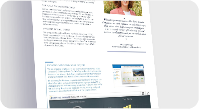60 SUSTAINABILITY CLIMATE AND ENVIRONMENT ENGAGING EMPLOYEES IN SOLAR PROJECTS We are engaging employees in our journey to contribute to a stable climate and a healthy planet. On Earth Day, we launched an interactive feature on our intranet that allows employees to view real-time solar energy-generation data from the Company’s on-site solar arrays. By accessing the link to each system’s solar dashboard, employees can view information such as the energy-generating capacity in MW of electricity and the real-time energy production in kilowatt hour (kWh) for each array. The data are displayed in daily, monthly, and yearly increments, as well as for the lifetime of the systems to date. DIRECT OPERATIONS (SCOPE 1 AND 2 EMISSIONS) We have adopted a portfolio approach to reducing GHGs, which includes the use of on-site renewables, energy efficiency projects, green utility contracts, and renewable energy credits. Our priority is to reduce our operational carbon footprint by deploying high-quality solutions and investing in projects to bring additional renewable energy to the grid. OUR FOCUS ON ENERGY EFFICIENCY We track environmental performance at our facilities * and have processes in place to collect energy metrics. We use this data to measure the effectiveness of energy-saving activities, which include energy-reduction projects such as lighting retrofits, air flow and temperature-management systems, occupancy sensors, and equipment upgrades to decrease overall energy use and carbon emissions. INVESTING IN WIND ENERGY We are party to a Virtual Power Purchase Agreement (VPPA) for 22 megawatts (MW) of wind power from the Ponderosa wind farm in Oklahoma, United States. This arrangement represents our largest renewable energy agreement to date. The Ponderosa wind farm generated more than 57,700 megawatt hours (MWh) of power in fiscal 2021. When large companies like The Estée Lauder Companies set their sights on an ambitious target, they can achieve huge change at a rapid pace. This is exactly the sort of leadership we need to see in the climate decade, as we work to halve global emissions. HELEN CLARKSON Chief Executive Officer, the Climate Group “ “ “ “ *Excludes sites that were acquired after January 1, 2020.