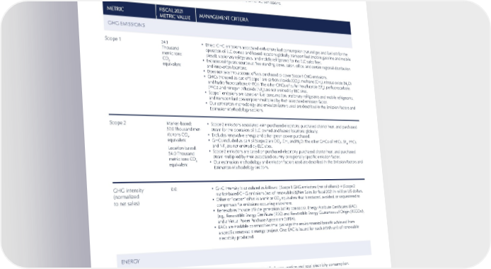 122 INDEPENDENT ASSURANCE STATEMENTS METRIC METRIC FISCAL 2021 FISCAL 2021 METRIC VALUE METRIC VALUE MANAGEMENT CRITERIA MANAGEMENT CRITERIA GHG EMISSIONS Scope 1 24.1 Thousand metric tons CO 2 equivalent • Direct GHG emissions associated with onsite fuel consumption (natural gas and fuel oil) for the operation of ELC owned and leased locations globally, transport fuel (mobile gasoline and mobile diesel), stationary refrigerants, and mobile refrigerants for the ELC sales fleet. • Excludes refrigerant sources at free standing stores, salon, office, and certain regional distribution and innovation locations. • Does not take into account offsets purchased to cover Scope 1 GHG emissions. • GHGs included as part of Scope 1 are carbon dioxide (CO 2 ), methane (CH 4 ), nitrous oxide (N 2 O) and hydro fluorocarbons (HFCs). The other GHGs of sulfur hexafluoride (SF 6 ), perfluorocarbons (PFCs) and nitrogen trifluoride (NF 3 ) are not emitted by ELC sites. • Scope 1 emissions are based on fuel consumption, stationary refrigerants and mobile refrigerants, and transport fuel consumption multiplied by their associated emission factor. • Our estimation methodology and emission factors used are described in the Emission Factors and Estimation Methodology sections. Scope 2 Market-based: 57.0 Thousand met- ric tons CO 2 equivalent Location-based: 54.0 Thousand metric tons CO 2 equivalent • Scope 2 emissions associated with purchased electricity, purchased district heat, and purchased steam for the operation of ELC owned and leased locations globally. • Excludes renewable energy and other green power purchased. • GHGs included as part of Scope 2 are CO 2 , CH 4 and N 2 O. The other GHGs of HFCs, SF 6 , PFCs, and NF 3 are not emitted by ELC sites. • Scope 2 emissions are based on purchased electricity, purchased district heat, and purchased steam multiplied by their associated country or regionally specific emission factor. • Our estimation methodology and emission factors used are described in the Emission Factors and Estimation Methodology sections. GHG intensity (normalized to net sales) 0.0 • GHG intensity is calculated as follows: [(Scope 1 GHG emissions (net of offsets)) + (Scope 2 market-based GHG emissions (net of renewables))]/Net Sales for fiscal 2021 in million US dollars. • Offset or “carbon” offset is a unit or CO 2 equivalent that is reduced, avoided, or sequestered to compensate for emissions occurring elsewhere. • Renewables include off-site generation (utility contracts), Energy Attribute Certificates (EAC) (e.g., Renewable Energy Certificate (REC) and Renewable Energy Guarantees of Origin (REGOs)), and a Virtual Power Purchase Agreement (VPPA). • EACs are tradable commodities that package the environmental benefit achieved from a specific renewable energy project. One EAC is issued for each MWh unit of renewable electricity produced. ENERGY Total energy consumption within the organization 289.6 Thousand MWh • Energy consumed from total fuel consumption and total electricity consumption. GREENHOUSE GAS (GHG) EMISSIONS AND ENERGY ELC uses the operational control approach in accordance with the World Resource Institute (WRI) and the World Business Council for Sustainable Development (WBCSD) Greenhouse Gas Protocol Initiative’s Corporate GHG Accounting and Reporting Standard, Revised (“GHG Protocol”) to report energy consumption and direct and indirect GHG emissions for sites where ELC has operational control. These sites include manufacturing, distribution, innovation, office, salon, and free-standing store locations that were in operation for all or part of fiscal 2021. Information related to DECIEM, a brand acquired during fiscal 2021, is excluded from the fiscal 2021 metrics. ELC uses the GHG Protocol to guide the criteria to assess, calculate, and report GHG emissions.