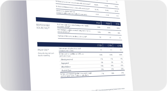 105 METRICS 26. Fiscal 2020 and fiscal 2019 metrics restated due to more accurate data capture of water discharge at ELC’s Melville manufacturing facility. Restated metrics include ‘Consumption’, ‘Discharge’, ‘% Water consumption from areas with water stress’, and ‘Water consumption intensity’. 27. Withdrawal, Consumption, and Discharge data reflects 59 locations (15 manufacturing sites, 38 distribution sites, and 6 innovation sites). Data includes groundwater withdrawal and return at the Melville manufacturing facility from approximately April through October each year as a result of cooling activities. Excludes brands acquired by ELC during or after fiscal 2020. 28. ELC’s Melville, New York, facilities, comprising a total of 5 locations, are located in areas of high water stress as defined by the World Resources Institute’s Water Risk Atlas tool (Aqueduct). They account for the majority of water withdrawal and consumption. Areas of water stress were determined based on an assessment of regions covering ELC manufacturing sites and select innovation sites. 29. Suppliers are those that provide direct raw material, ingredient, packaging, and Third-Party Manufacturing to ELC. 30. Excludes suppliers to certain acquired brands that are not yet fully integrated into the relevant ELC systems. 31. Strategic suppliers include those that are highly critical suppliers with broad and unique capabilities, proven value creation, and a high level of collaboration. These suppliers comprise more than half of ELC direct spend. 32. Includes third party audits requested by ELC, as well as other mutually recognized audits that align to ELC audit standard and are conducted by third-party auditors. 33. Palm oil sourcing is reported by Calendar Year (CY) in alignment with the Roundtable on Sustainable Palm Oil (RSPO) Annual Communication of Progress (ACOP) guidelines. Excludes palm-based ingredients not directly procured by ELC, such as those procured by Third-Party Manufacturers (TPMs) and certain acquired brands not yet fully integrated into the relevant ELC systems. FY21 FY21 FY20 FY20 FY19 FY19 WATER 26 (MILLION CUBIC METERS) Amounts may not sum due to rounding Withdrawal 27 1.5 1.5 1.6 Consumption 0.1 0.1 0.2 Discharge 27 1.4 1.3 1.4 % Water consumption from all areas with water stress 28 46.8% 44.8% 41.1% % Water withdrawn from all areas with water stress 28 80.5% 76.9% 82.4% Water consumption intensity (thousand cubic meters normalized to net sales) <0.01 <0.01 0.01 CY20 CY20 CY19 CY19 CY18 CY18 PALM OIL 33 Amounts may not sum due to rounding Total amount of palm oil sourced (thousand metric tons) 3.6 4.0 4.6 % Total palm oil certified by RSPO, by certification type 100% 100% 100% Identity preserved <1% <1% <1% Segregated 0% 0% 0% Mass Balance 70% 57% 47% Book & Claim 29% 42% 52% % Total palm-based ingredients sourced through certified-sustainable physical supply chains 71% 58% 47% FY21 FY21 FY20 FY20 FY19 FY19 RESPONSIBLE SOURCING 29 % of new suppliers screened using environmental and social criteria 30 100% 100% 100% % of strategic suppliers screened using environmental and social criteria 31 100% 98% 85% Number of third-party on-site supplier audits 32 52 67 51